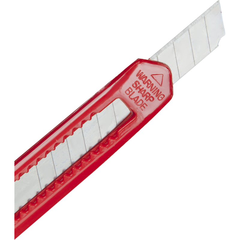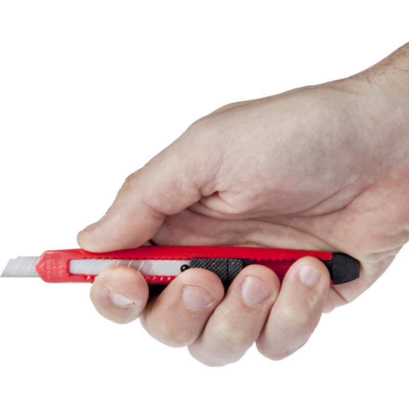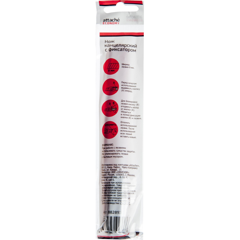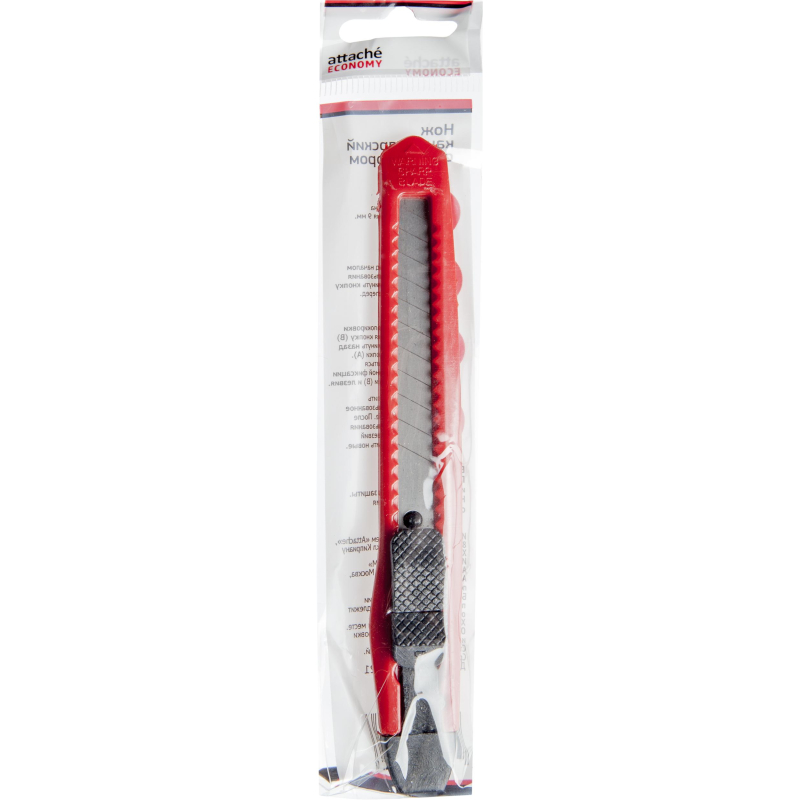 Нож канцелярский Attache Economy с сегментированным отламывающимся лезвием. Данная экономичная модель ножа оптимальна для резки бумаги, распечатывания корреспонденции и посылок. Особенности изделия: - корпус выполнен из экономичного пластика; - сменное сегментированное лезвие из стали; - удобная система блокировки лезвия - защелка (Push-Lock). Характеристики изделия: - длина ножа 130,0 мм; - ширина лезвия 9,0 мм; - толщина лезвия 0,33 мм; - количество рабочих сегментов 13 штук. Схема замены лезвия: 1. Снять с корпуса торцевую заглушку. 2. Извлечь из корпуса каретку. 3. Снять со шпинделя отработанное лезвие, установить новое. 4. Вставить каретку в направляющую и вернуть на место торцевую заглушку. Меры предосторожности: - при работе с лезвиями используйте средства защиты; - не утилизируйте лезвия с бытовыми отходами; - хранить в недоступном для детей месте.Внимание! Товар поставляется в нескольких вариантах цвета/дизайна (без возможности выбора).