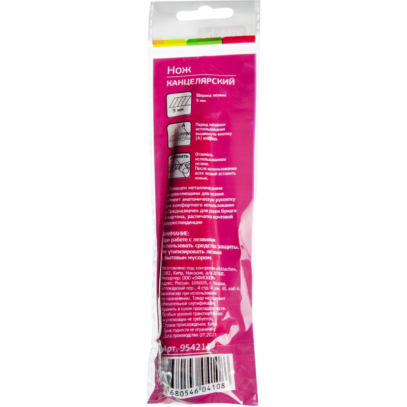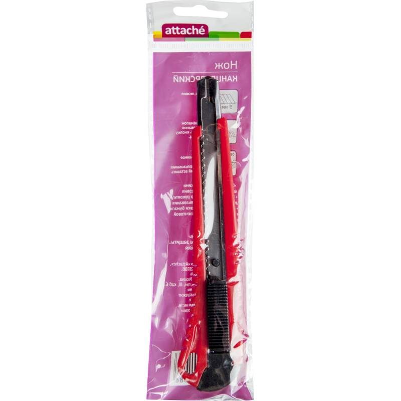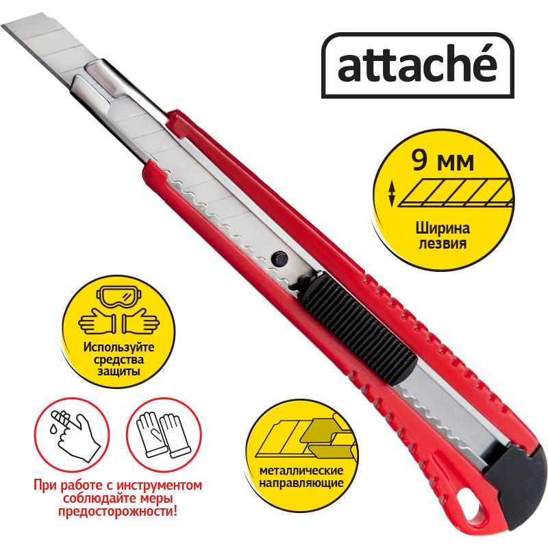 Нож канцелярский Attache с сегментированным отламывающимся лезвием. Данная модель ножа оптимальна для резки бумаги, распечатывания корреспонденции и посылок. Нож оснащен эргономичной ребристой рукояткой для увеличения противоскользящих свойств. Металлическая направляющая из нержавеющей стали обеспечивает надежную фиксацию лезвия в момент использования. На рукоятке предусмотрено отверстие для подвешивания ножа при хранении.Особенности изделия:- Корпус выполнен из пластика.- Сменное сегментированное лезвие из стали.- Система автоматической фиксации лезвия (Auto-lock) позволяет отрегулировать длину лезвия и закрепить его положение.Характеристики изделия:- Длина ножа: 135 миллиметров.- Ширина лезвия: 9 миллиметров.- Толщина лезвия: 0,35 миллиметров.- Количество рабочих сегментов: 13 шт.Схема замены лезвия:1. Снять с корпуса торцевую заглушку.2. Извлечь из корпуса каретку.3. Снять со шпинделя отработанное лезвие, установить новое.4. Вставить каретку в направляющую и вернуть на место торцевую заглушку.Меры предосторожности: при работе с лезвиями используйте средства защиты. Не утилизируйте лезвия с бытовыми отходами. Хранить в недоступном для детей месте.Внимание! Товар поставляется в нескольких вариантах цвета/дизайна (без возможности выбора).