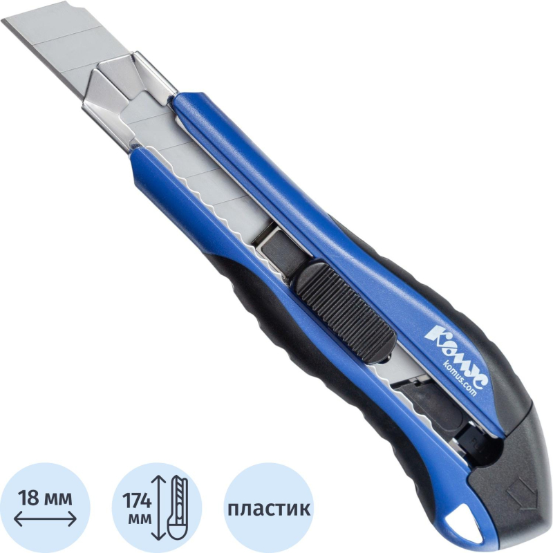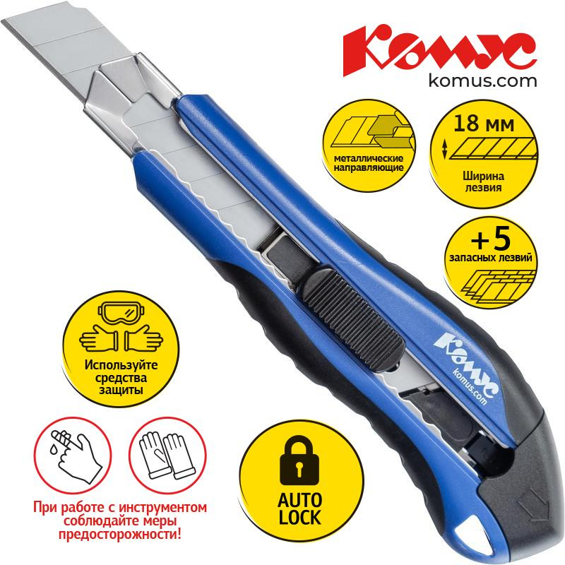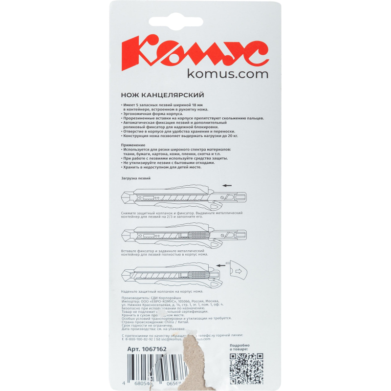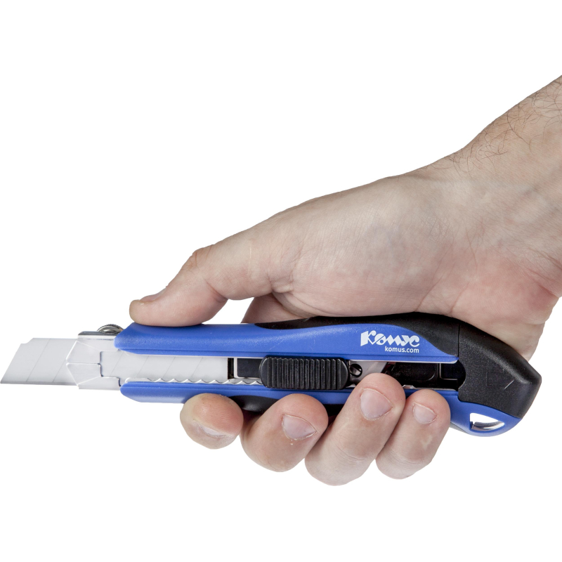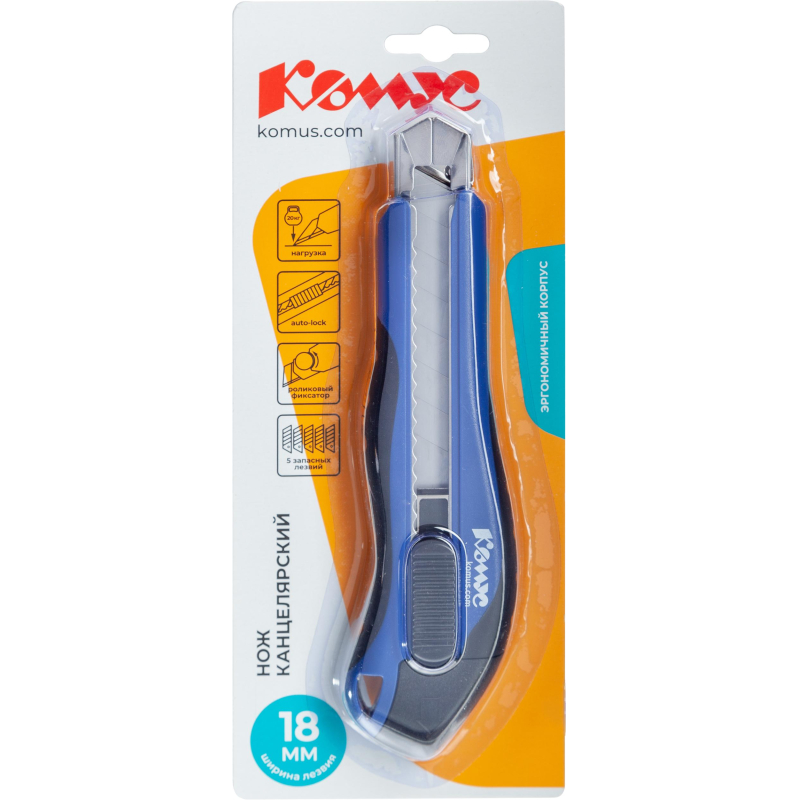 Нож канцелярский Комус с сегментированным отламывающимся лезвием. Подходит для резки бумаги, ткани, картона, пленки, ленты стрейч, кожи, складских работ, а также для проведения ремонтных работ, не требующих приложения больших усилий. Нож оснащен эргономичной рукояткой с прорезиненными противоскользящими вставками контрастного цвета. Металлическая направляющая из нержавеющей стали обеспечивает надежную фиксацию лезвия в момент использования. На рукоятке предусмотрено отверстие для удобства хранения и переноски. Особенности изделия: — Корпус выполнен из экономичного пластика — Сменные сегментированные лезвия из стали — Автоматическая блокировка лезвия (Auto-Lock) — Запасные лезвия в комплекте 5 шт. (находятся в корпусе ножа) Характеристики изделия: — Длина ножа 174,0 мм — Ширина лезвия 18,0 мм — Толщина лезвия 0,5 мм — Количество рабочих сегментов 8 шт. Схема замены лезвия: 1. Снять с корпуса торцевую заглушку 2. Извлечь из корпуса каретку 3. Снять со шпинделя отработанное лезвие, установить новое 4. Вставить каретку в направляющую и вернуть на место торцевую заглушку Меры предосторожности: — При работе с лезвиями используйте средства защиты — Не утилизируйте лезвия с бытовыми отходами — Хранить в недоступном для детей месте