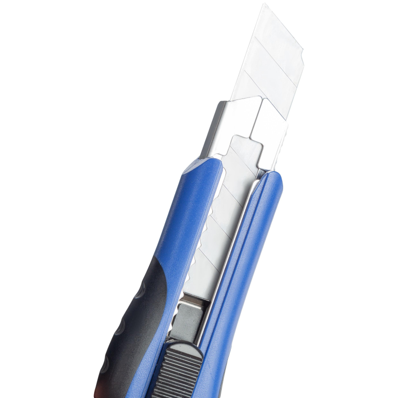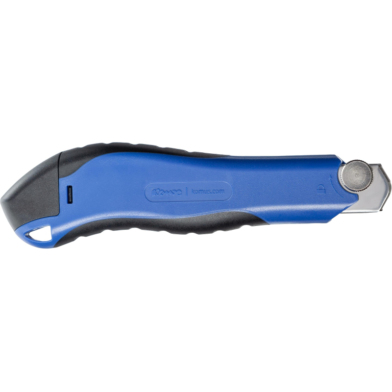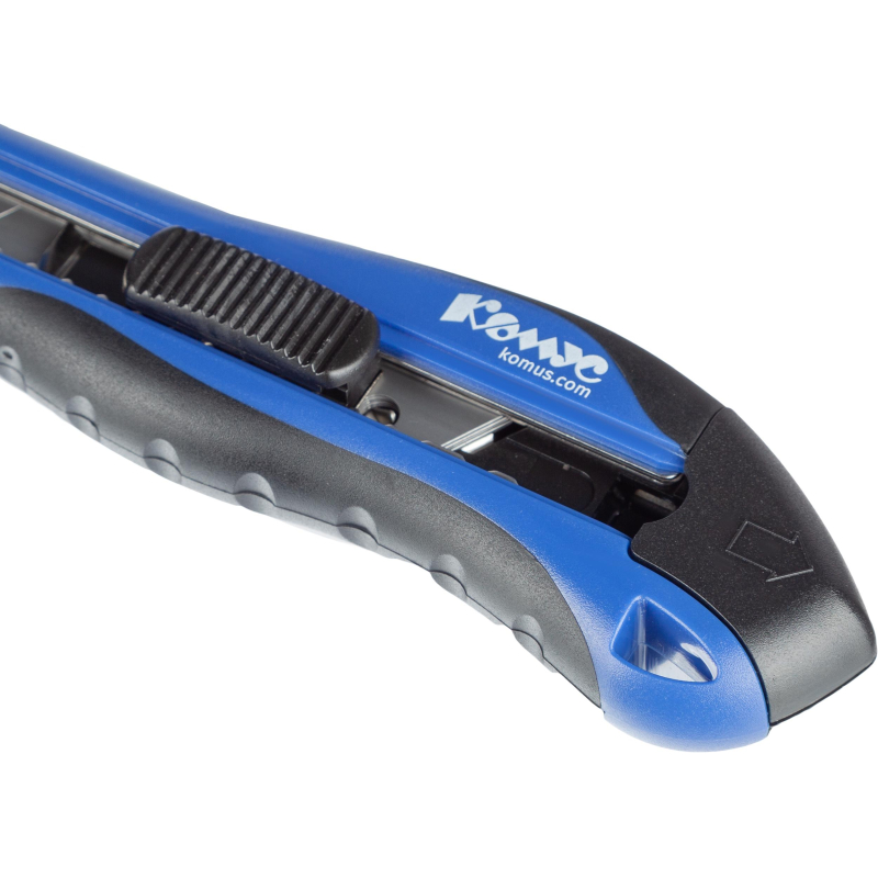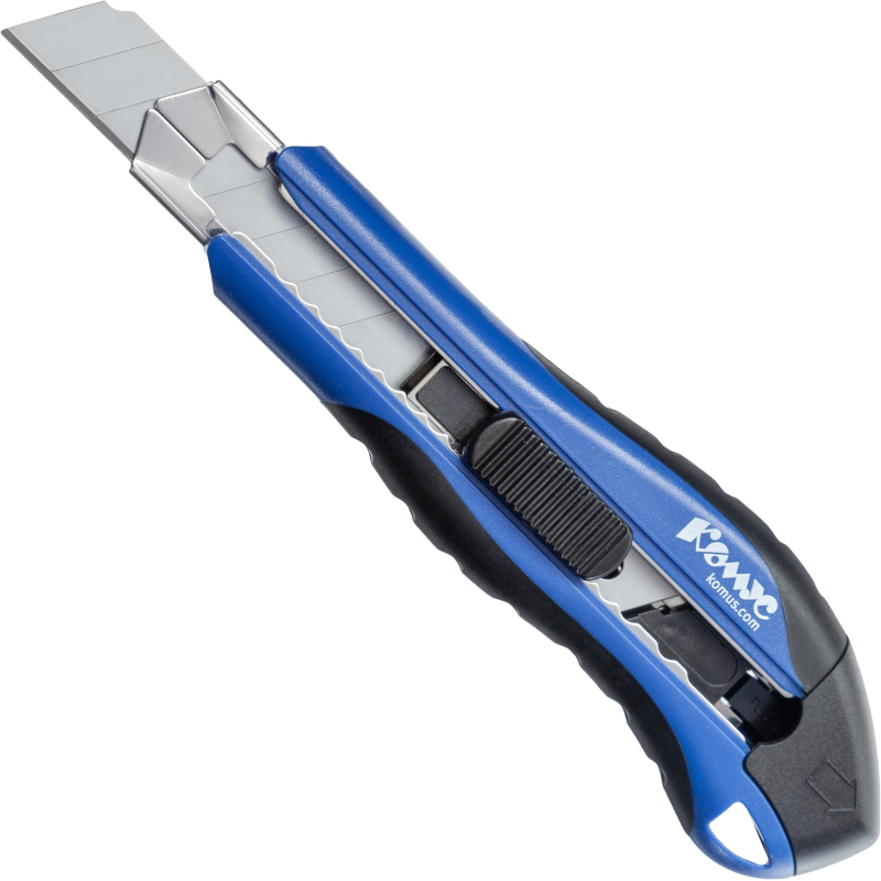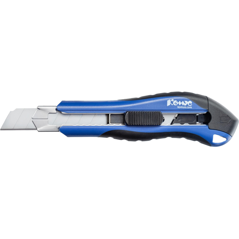 Нож канцелярский Комус с сегментированным отламывающимся лезвием. Подходит для резки бумаги, ткани, картона, пленки, ленты стрейч, кожи, складских работ, а также для проведения ремонтных работ, не требующих приложения больших усилий. Нож оснащен эргономичной рукояткой с прорезиненными противоскользящими вставками контрастного цвета. Металлическая направляющая из нержавеющей стали обеспечивает надежную фиксацию лезвия в момент использования. На рукоятке предусмотрено отверстие для удобства хранения и переноски. Особенности изделия: — Корпус выполнен из экономичного пластика — Сменные сегментированные лезвия из стали — Автоматическая блокировка лезвия (Auto-Lock) — Запасные лезвия в комплекте 5 шт. (находятся в корпусе ножа) Характеристики изделия: — Длина ножа 174,0 мм — Ширина лезвия 18,0 мм — Толщина лезвия 0,5 мм — Количество рабочих сегментов 8 шт. Схема замены лезвия: 1. Снять с корпуса торцевую заглушку 2. Извлечь из корпуса каретку 3. Снять со шпинделя отработанное лезвие, установить новое 4. Вставить каретку в направляющую и вернуть на место торцевую заглушку Меры предосторожности: — При работе с лезвиями используйте средства защиты — Не утилизируйте лезвия с бытовыми отходами — Хранить в недоступном для детей месте