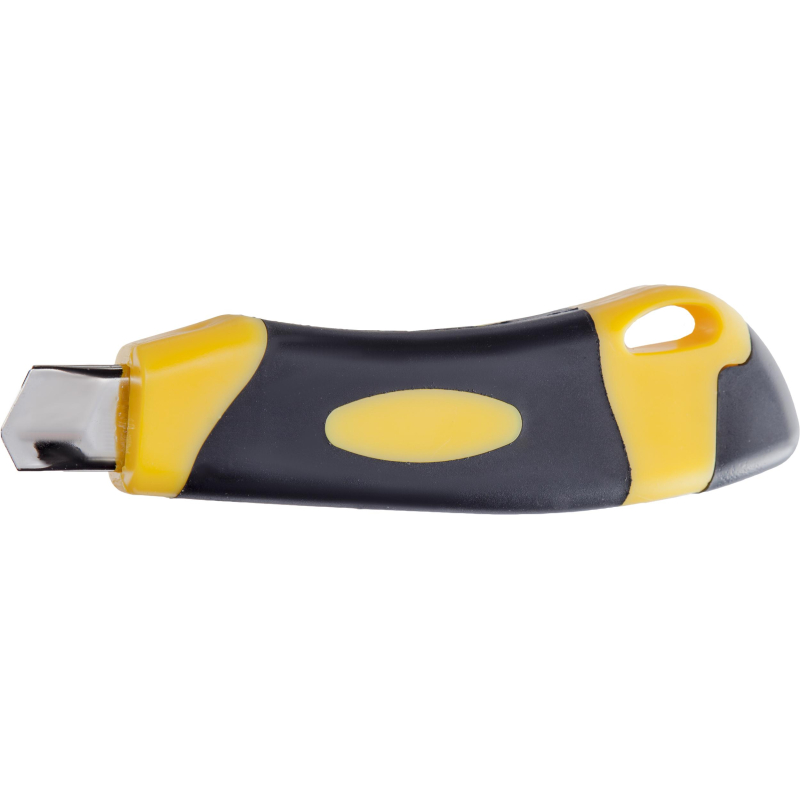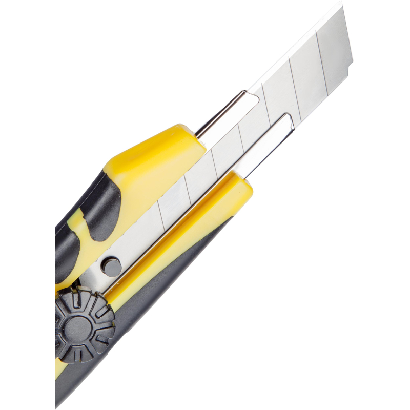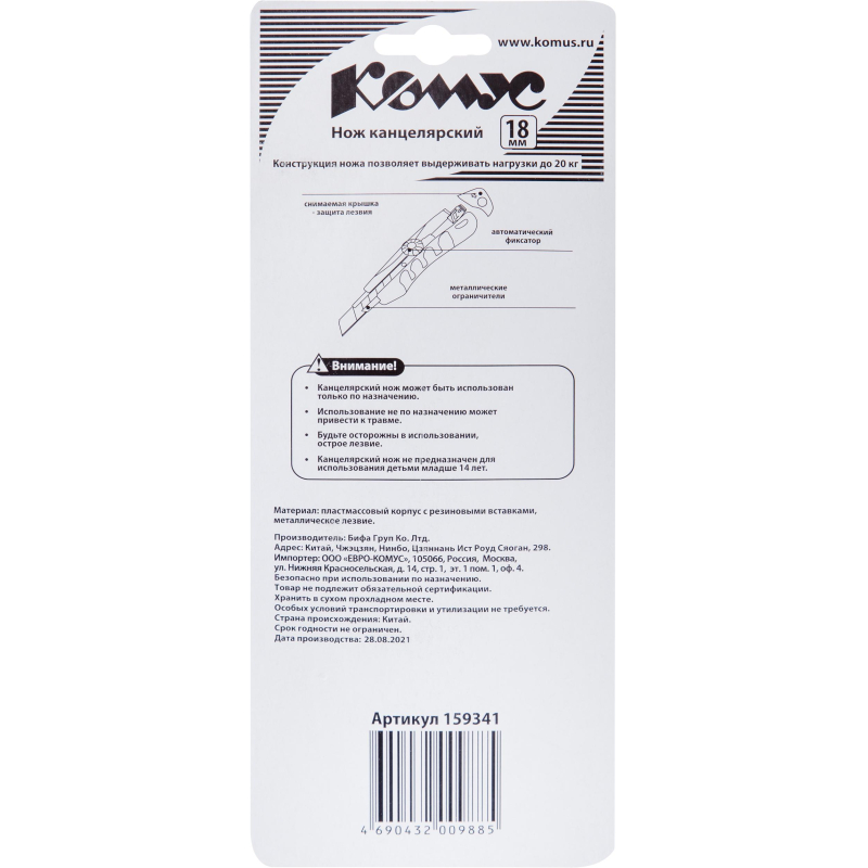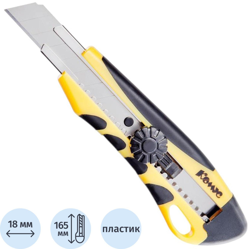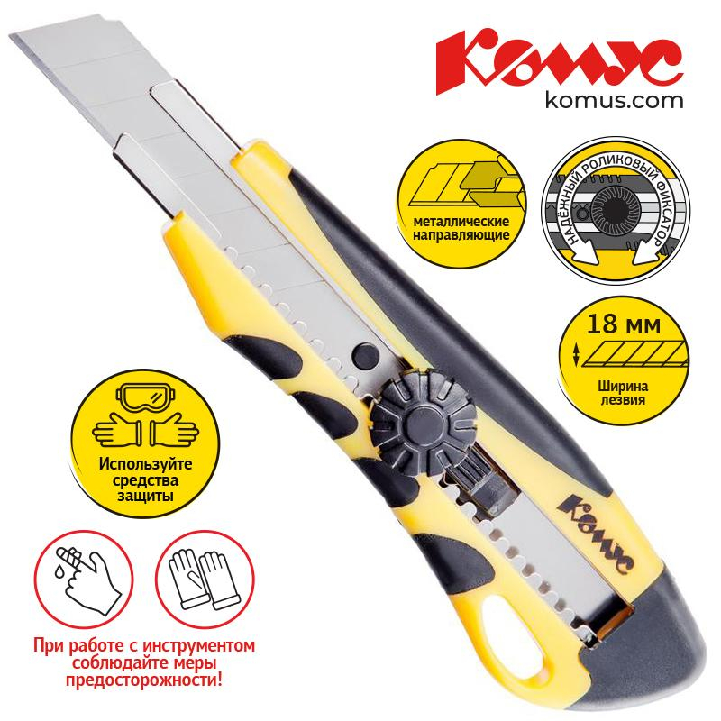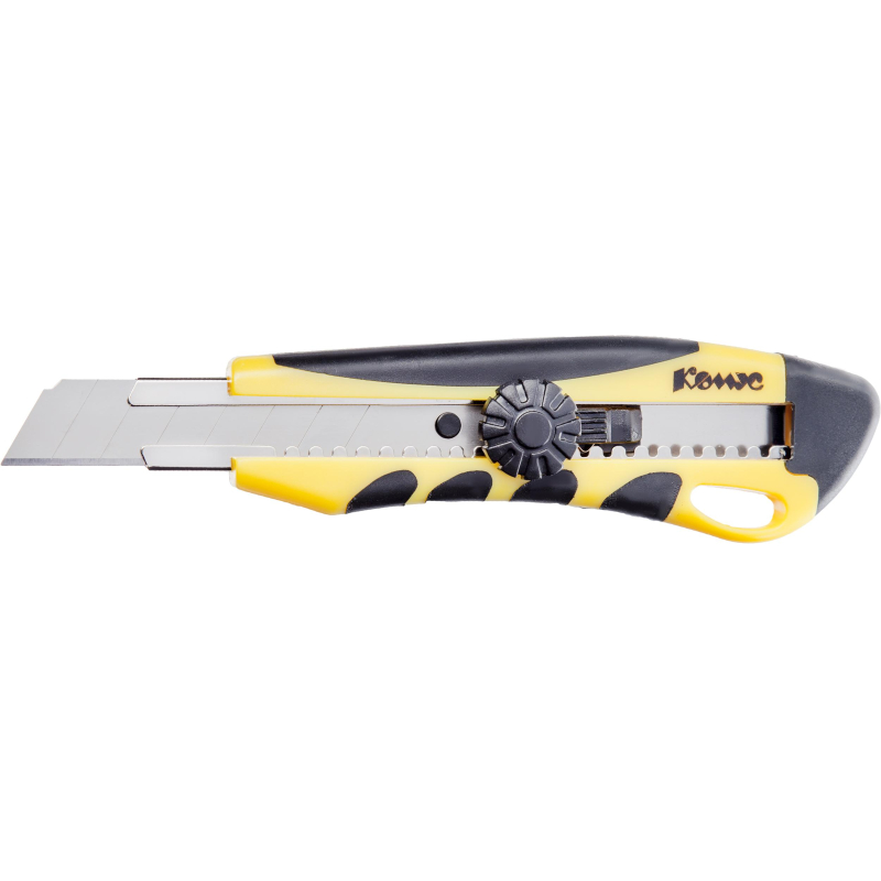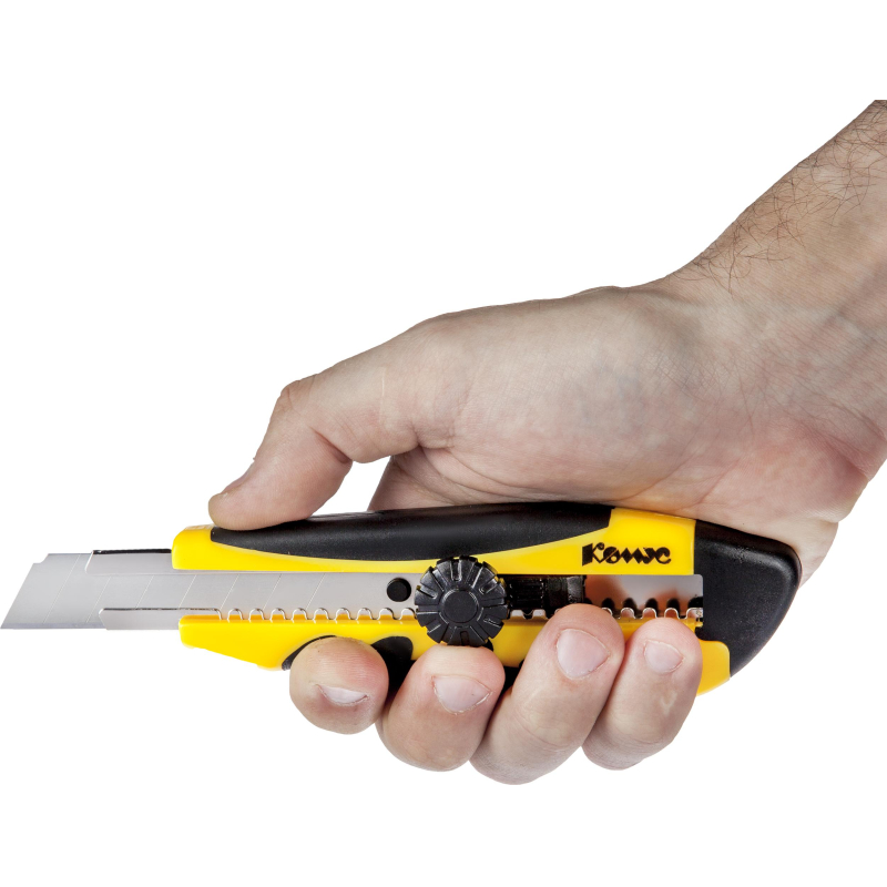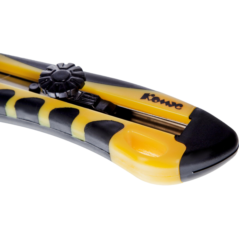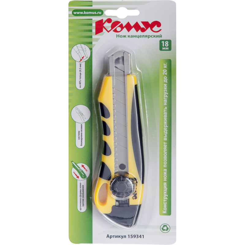 Нож канцелярский 'Комус' с сегментированным отламывающимся лезвием. Оснащен эргономичной рукояткой с противоскользящими вставками контрастного цвета. Металлические направляющие из нержавеющей стали обеспечивают надежную фиксацию лезвия в момент использования. Нож промышленного использования удобен для применения в строительстве, проведении ремонта. Особенности изделия: - Корпус выполнен из пластика; - Сменное сегментированное лезвие из стали; - Надежный механизм фиксации лезвия - винтовой (Twist-Lock). Характеристики изделия: - Длина ножа: 165 мм; - Ширина лезвия: 18 мм; - Толщина лезвия: 0,49 мм; - Количество рабочих сегментов 8 шт. Схема замены лезвия: 1. Открутите и снимите роликовый фиксатор. 2. Снять со шпинделя отработанное лезвие, установить новое. 3. Закрутите роликовый фиксатор. Меры предосторожности: При работе с лезвиями используйте средства защиты. Не утилизируйте лезвия с бытовыми отходами. Хранить в недоступном для детей месте.