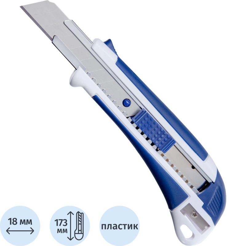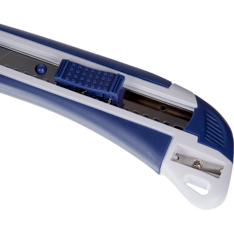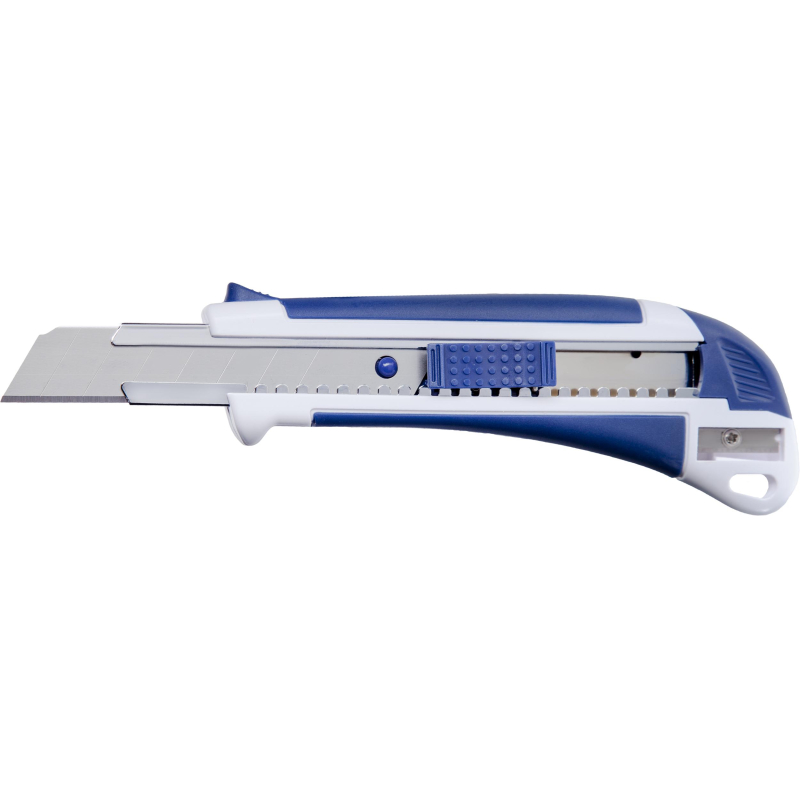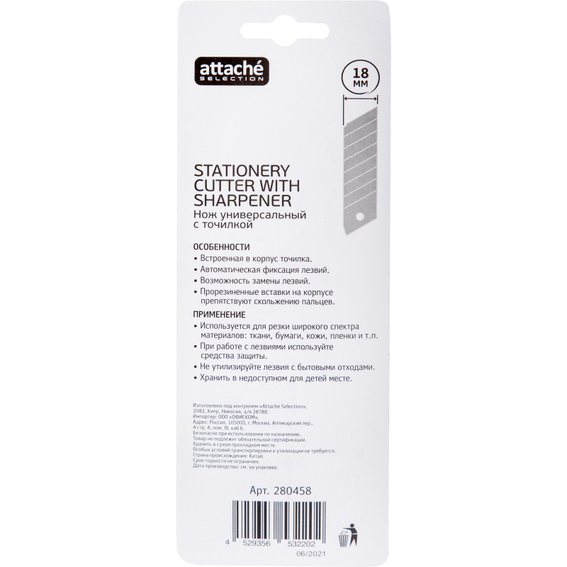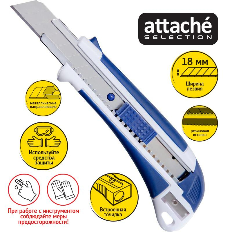 Нож канцелярский Attache Selection с антискользящими вставками и точилкой для карандаша. Используется для резки бумаги, плотного картона, распечатки корреспонденции и посылок. Эргономичная рукоятка с резиновыми вставками контрастного цвета, для увеличения противоскользящих свойств. Металлические направляющие для лезвия увеличивают прочность ножа, создают дополнительную жесткость при разрезании плотных материалов.Особенности изделия:— Корпус выполнен из пластика — Сменные сегментированные лезвия из стали — Система автоматической фиксации лезвия (<nobr>Auto-lock</nobr>) позволяет отрегулировать длину лезвия и закрепить его положениеХарактеристики изделия:— Длина ножа 173,0 мм— Ширина лезвия 18,0 мм— Толщина лезвия 0,5 мм— Количество рабочих сегментов 8 шт.Схема замены лезвия:1. Снять с корпуса торцевую заглушку2. Извлечь из корпуса каретку3. Снять со шпинделя отработанное лезвие, установить новое4. Вставить каретку в направляющую и вернуть на место торцевую заглушкуМеры предосторожности: — При работе с лезвиями используйте средства защиты — Не утилизируйте лезвия с бытовыми отходами — Хранить в недоступном для детей месте