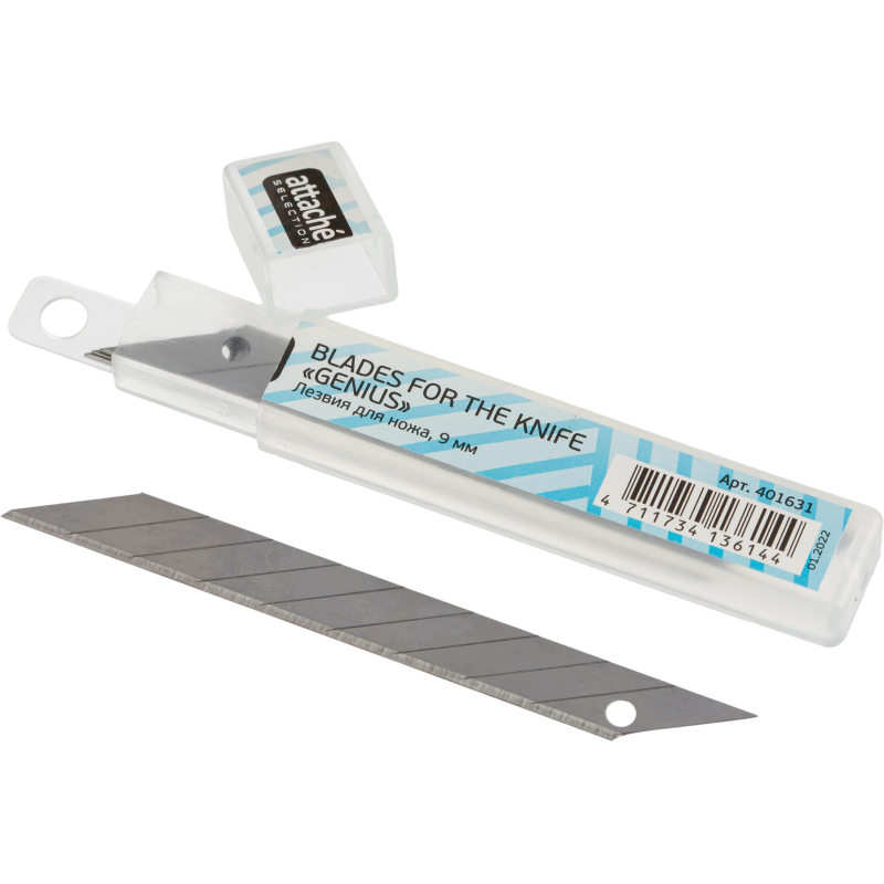 Набор запасных сегментированных лезвий Attache Selection Genius. Активно используются в канцелярии, а также для ремонтных работ, не требующих приложения больших усилий. Особенности изделия: - Сменные сегментированные лезвия из стали - Лезвия для ножа Attache Selection Genius (арт. 389386) - В комплекте 10 шт. Характеристики изделия: - Ширина лезвия 9,0 мм - Толщина лезвия 0,4 мм - Количество рабочих сегментов 13 шт. Меры предосторожности: - При работе с лезвиями используйте средства защиты - Не утилизируйте лезвия с бытовыми отходами - Хранить в недоступном для детей месте