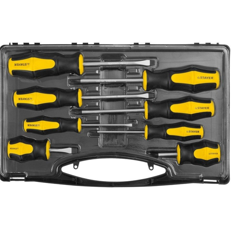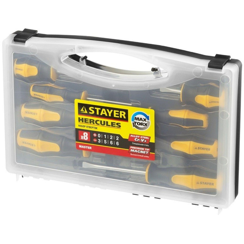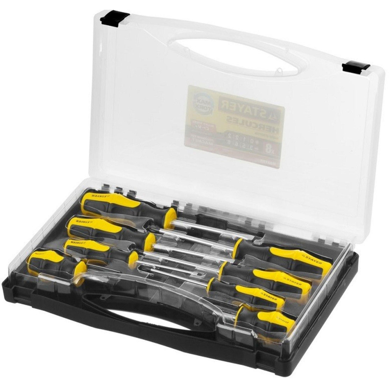 Набор отверток Stayer Master Hercules 8 штук (25055-H8_z02) предназначен для монтажа и демонтажа резьбовых соединений. Эргономичная двухкомпонентная рукоятка оптимальной формы обеспечивает как передачу высокого крутящего момента от руки к профилю крепежа, так и быстрое выполнение работ, не требующих больших усилий. Стержни из хромованадиевой стали обладают повышенной прочностью и долговечностью. Набор из 8 предметов: SL: 3 х75; 5 х 100; 6 х 100; 2 х 38 мм. PH: 0 х 75; 1 х 100; 2 х 100 2 х 38 мм. <!--noindex-->Товар относится к ценовому сегменту "бюджет". Имеет базовые характеристики и более простую упаковку. Отвечает основным требованиям потребления<!--/noindex--><!--noindex-->Внешний вид и/или характеристики товара могут быть изменены производителем в соответствии с производственным процессом.<!--/noindex-->