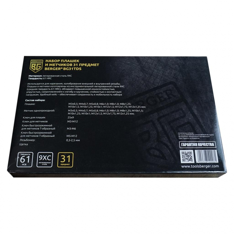Набор плашек и метчиков Berger используется для нарезания различной резьбы на внутренних и внешних металлических поверхностях. Метчико- и плашкодержатели оснащены удобными рукоятками, что обеспечивает комфортную работу инструментом. В наборе: - 12 плашек: М3 х 0,5; М4 х 0,7; М5 х 0,8; М6 х 1,0; М8 х 1,0; М8 х 1,25; М10 х 1,5; М10 х 1,25; М10 х 1; М12 х 1,5; М12 х 1,75; М12 х 1,25 мм, - 12 однопроходных метчиков: М3 х 0,5; М4 х 0,7; М5 х 0,8; М6 х 1,0; М8 х 1,0; М8 х 1,25; М10 х 1,5; М10 х 1,25; М10 х 1; М12 х 1,5; М12 х 1,75; М12 х 1,25 мм, - 1 ключ для плашек 25 х 9, - 1 ключ для метчиков М3-М12, - 1 быстрозажимной Т-образный ключ для метчиков М3-М6, - 1 быстрозажимной Т-образный ключ для метчиков М5-М12, - 1 резьбомер 0,5-2,5 мм, - 1 щетка, - 1 отвертка.Внешний вид и/или характеристики товара могут быть изменены производителем в соответствии с производственным процессом.