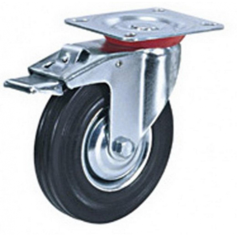 Колесо промышленное поворотное с тормозомШины: двухкомпонентные литые, состоящие из твердого резинового сердечника и высокоэластичного контактного слоя, черные.Обод: из листовой стали, со стальной ступицей, на игольчатом подшипнике, оцинкован.Модель: SCbКолесная опора: поворотная с тормозомДиаметр: 200 ммВысота до опоры: 235 ммНагрузка: 150 кгВнимание! Набор крепежных элементов (метизы) в комплект поставки не входят. Приобретаются отдельно.