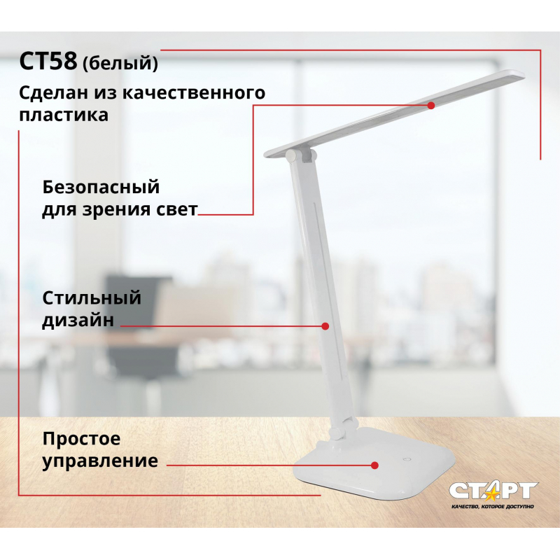 Светильник настольный Старт СТ58 белый Внешний вид и/или характеристики товара могут быть изменены производителем в соответствии с производственным процессом.