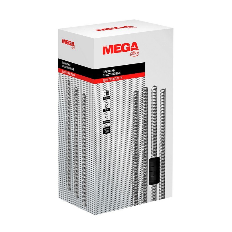 Пружины для переплета пластиковые ProMega office предназначены для сшивания до 280 листов формата А4 при помощи брошюровщика. Позволяют вынимать и добавлять листы в готовый документ. Изготовлены из прочного пластика черного цвета, состоят из 21 кольца диаметром 32 мм, шаг переплета - 3:1. Поставляются по 50 штук в упаковке. Внимание! Стандартная длина пружины: 288-293 мм. В производстве допускается выпуск до 0.25% продукции с отклонением от стандартной длины на +/- 1 мм. Данные пружины пригодны для использования после ручной регулировки в брошюровальной машине. Товар относится к ценовому сегменту 'бюджет'. Имеет базовые характеристики и более простую упаковку. Отвечает основным требованиям потребления.