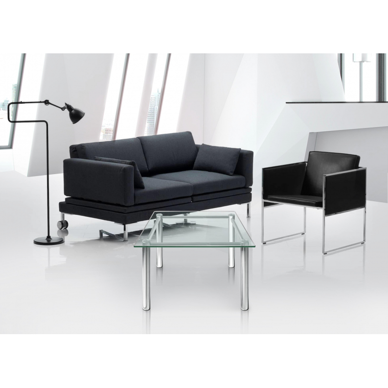 Журнальный стол выполнен из металлических труб. Цвет каркаса: гальванический хром. Материал верхних заглушек: гальванический хром. Столешница выполнена из прозрачного стекла.