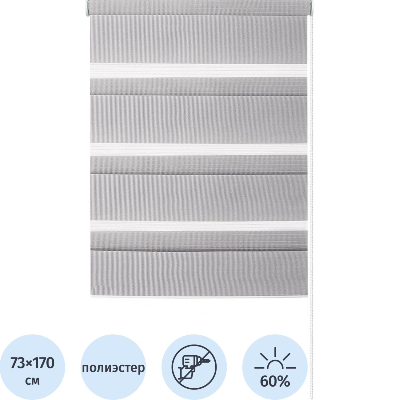 Внимание! Пожалуйста, проверяйте цвет изделия до начала сборки! Цвет на изображении товара в интернет-магазине или в печатном каталоге может отличаться от оригинала из-за особенностей цветопередачи. Рулонная штора является популярным и практичным вариантом декора окна. Функция день-ночь позволяет быстро менять степень освещенности комнаты. Конструкция включает два полотна с полосами разной степени плотности, регулируемых цепочкой. Размеры (ШхВ): 73x170 см.