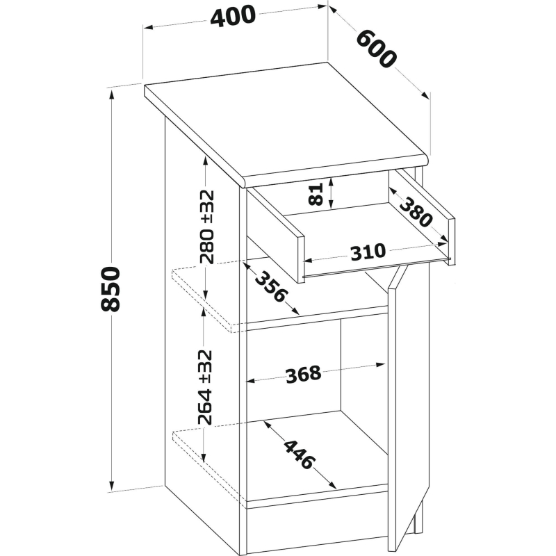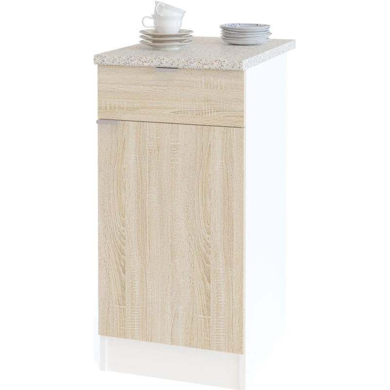 Кухонная рабочая тумба со столешницей, встроенным ящиком и полкой внутри. Дверь можно навесить на любую сторону. В ящике используются роликовые направляющие. Высота столешницы - 26 мм. Стол сделан из ЛДСП 16 мм, края обработаны кромкой ПВХ 0,4 мм. Ручки - металлические. Столешница изготовлена из ЛДСП с прочным тонким влагостойким бумажно-слоистым пластиком. <!--noindex-->Изображения товаров на сайте не могут гарантировать точную цветопередачу.<!--/noindex-->