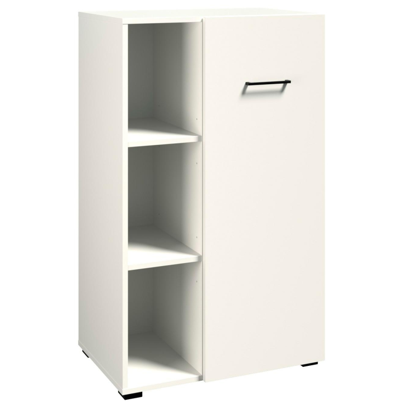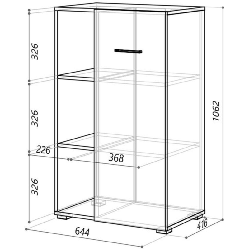 Шкаф средний полузакрытый с полками, с асимметричными открытыми полками и одним распашным фасадом, ручка металлическая L128 черного цвета, ножки с регулировкой по высоте укомплектованы прокладками самоклеящимися войлочными. Задняя стенка HDF 3 мм, все детали мебели ЛДСП 16 мм, кромка ПВХ 1 мм, фактически видимые части деталей - 1 мм, а остальное бумажная кромка 0,5 мм. Изображения товаров на сайте не могут гарантировать точную цветопередачу.