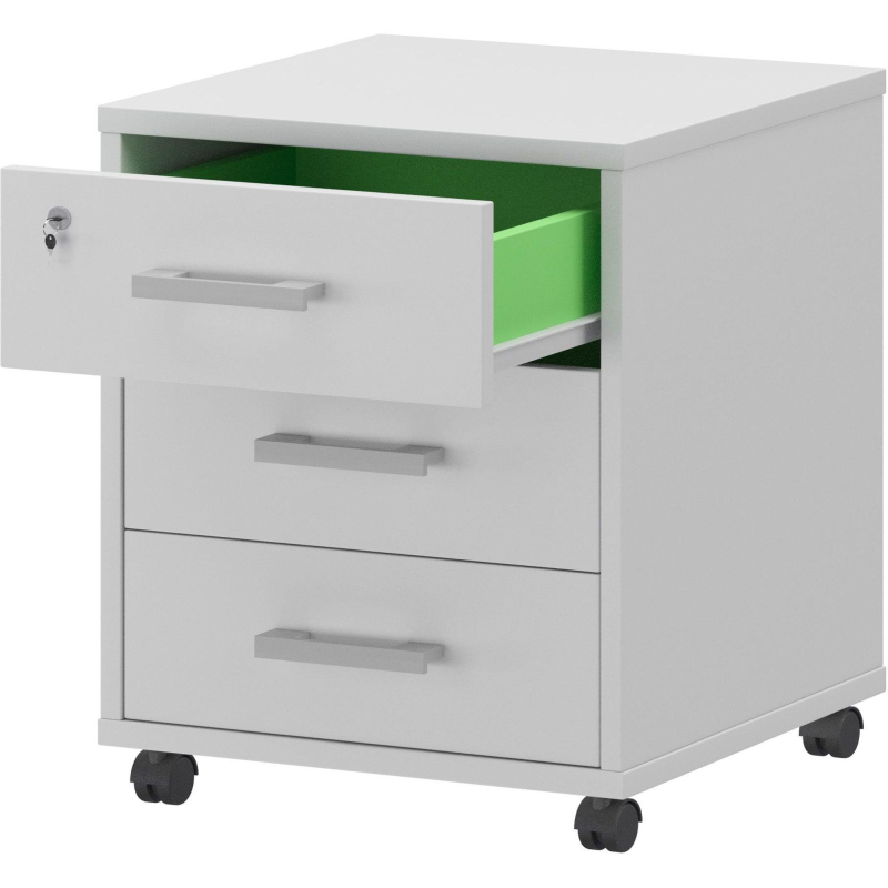 Внимание! Пожалуйста, проверяйте цвет изделия до начала сборки! Цвет на изображении товара в интернет-магазине или в печатном каталоге может отличаться от оригинала из-за особенностей цветопередачи.Тумба подкатная "Арго" имеет размеры 58x44 см и глубину 45 см. Изготовлена из деревоплиты (ЛДСП) с износостойким ламинированным покрытием белого цвета. Оснащена тремя выдвижными ящиками, верхний из которых закрывается на ключ. Кромки отделаны лентой из ПВХ для защиты от повреждений. Основание тумбы с четырьмя роликами для удобного перемещения. Боковая и задняя стенка выдвижного ящика выполнена в цвете лайм.