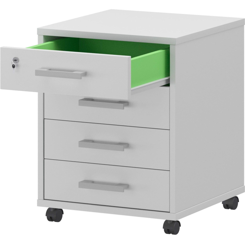 Внимание! Пожалуйста, проверяйте цвет изделия до начала сборки! Цвет на изображении товара в интернет-магазине или в печатном каталоге может отличаться от оригинала из-за особенностей цветопередачи. Тумба подкатная 'Арго' АТ-04 выполнена из ламинированной древесно-стружечной плиты (ЛДСП) толщиной 18 мм. Кромки защищены лентой ПВХ, толщиной 2 мм. Задняя стенка и дно ящиков выполнены из ДВП. В тумбе имеются 4 ящика, верхний из которых закрывается на замок. Размер тумбы: 440x450x600 мм. Цвет: белый. Боковая и задняя стенка выдвижного ящика выполнена в цвете лайм. Тумба подкатная, установлены ролики.