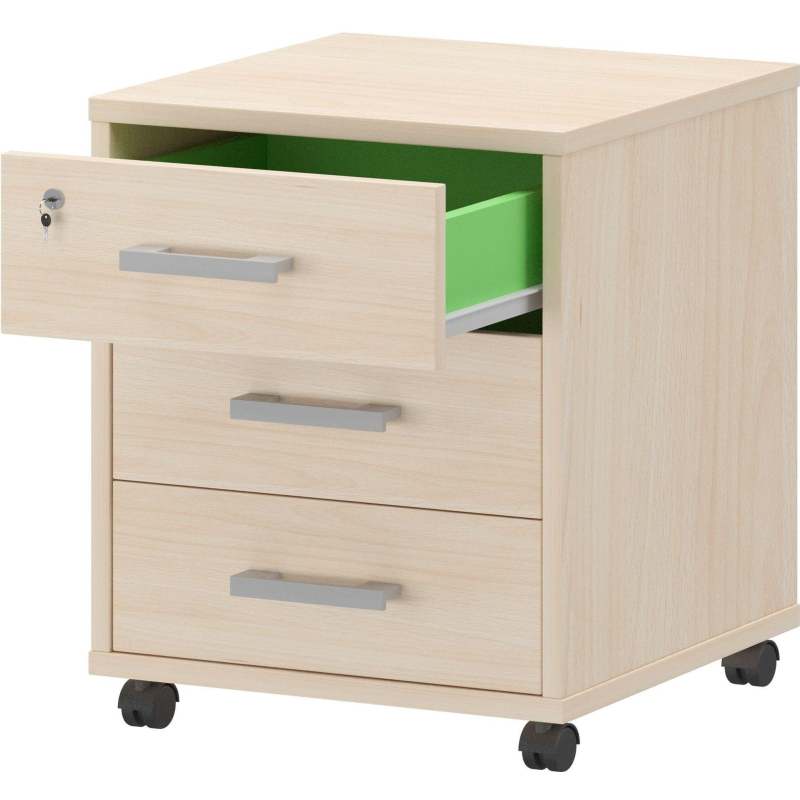 Внимание! Пожалуйста, проверяйте цвет изделия до начала сборки! Цвет на изображении товара в интернет-магазине или в печатном каталоге может отличаться от оригинала из-за особенностей цветопередачи.Выкатная тумба Арго имеет размеры 58x44 см и глубину 45 см. Изготовлена из деревоплиты (ДСП) с износостойким ламинированным покрытием цвета бук. Оснащена тремя выдвижными ящиками, верхний из которых закрывается на ключ. Кромки отделаны лентой из ПВХ для защиты от повреждений. Основание тумбы с четырьмя роликами для удобного перемещения. Боковая и задняя стенка выдвижного ящика выполнена в цвете лайм.