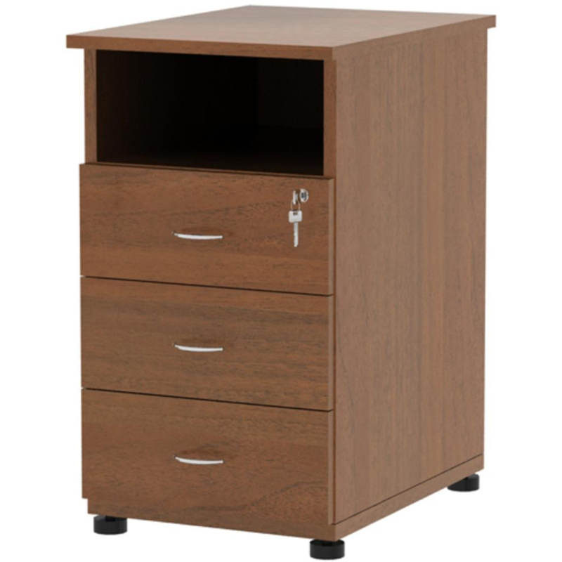 Внимание! Пожалуйста, проверяйте цвет изделия до начала сборки! Цвет на изображении товара в интернет-магазине или в печатном каталоге может отличаться от оригинала из-за особенностей цветопередачи.Тумба Этюд выполнена из ЛДСП цвета орех. Имеет три выдвижных ящика, верхний из которых закрывается на замок, и расположенную над ними открытую нишу для документов. Кромки отделаны лентой из прочного ПВХ для защиты от повреждений. Материал и толщина топа и кромки: ЛДСП 18 мм, ПВХ 0,45 мм. Материал и толщина каркаса и кромки: ЛДСП 18 мм, ПВХ 0,45 мм. Материал и толщина задней стенки: ЛДСП 18 мм.