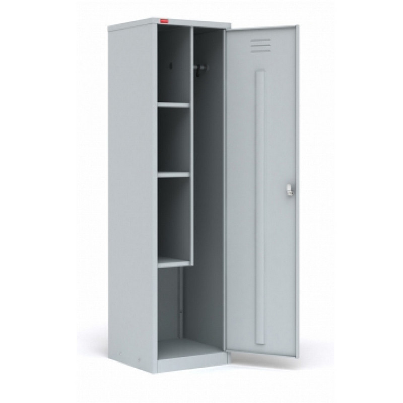 Внимание! Пожалуйста, проверяйте цвет изделия до начала сборки! Цвет на изображении товара в интернет-магазине или в печатном каталоге может отличаться от оригинала из-за особенностей цветопередачи. Шкаф хозяйственный металлический разборный, предназначен для хранения сменной одежды и инвентаря. В стандартную комплектацию каждого шкафа входят три полки, перекладина для вешалки и крючки для одежды. Шкаф оснащен врезным замком.