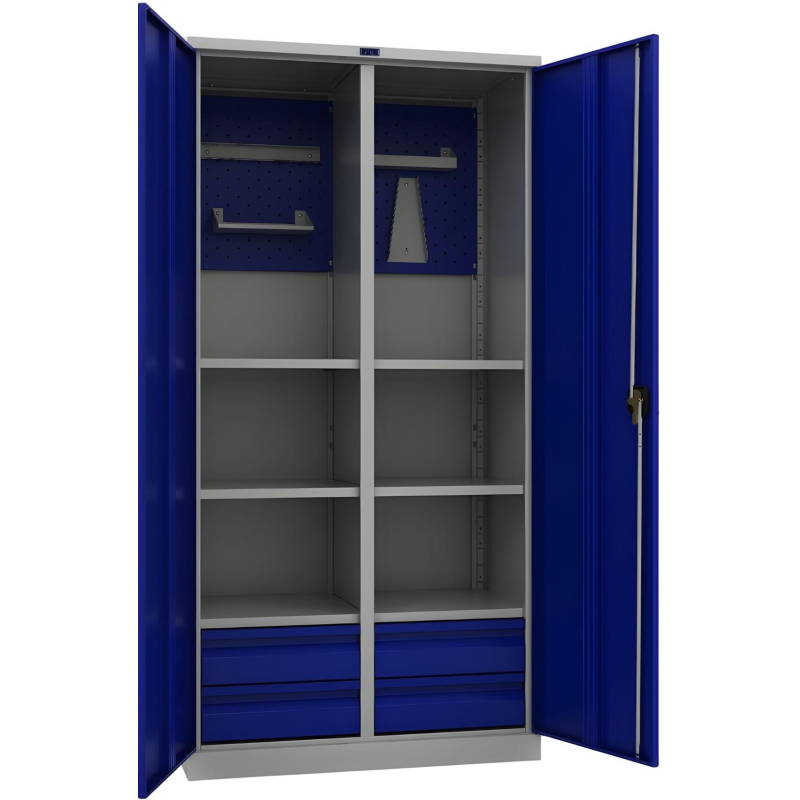 Внимание! Пожалуйста, проверяйте цвет изделия до начала сборки! Цвет на изображении товара в интернет-магазине или в печатном каталоге может отличаться от оригинала из-за особенностей цветопередачи. Шкаф инструментальный ТС-1995-120604 комплект №3. Предназначен для хранения инструментов, слесарных приспособлений и других изделий на предприятиях, мастерских, автосервисах. Сертифицированы на соответствие требованиям ГОСТ 16371. Ригели изготовлены из оцинкованной стали, пластиковые втулки обеспечивают бесшумный ход дверей и надежное запирание шкафа. Комплектуются ключевыми замками с ручками (Burg GSC813, 2 ключа в комплекте). Максимальная нагрузка на шкаф ТС 1995 - 500 кг. Максимальная нагрузка на полку - 80 кг. Стандартный цвет: серый полуматовый (RAL 7038), двери синие (RAL 5002). Тип покрытия: порошковое. Поставляются в разобранном виде.