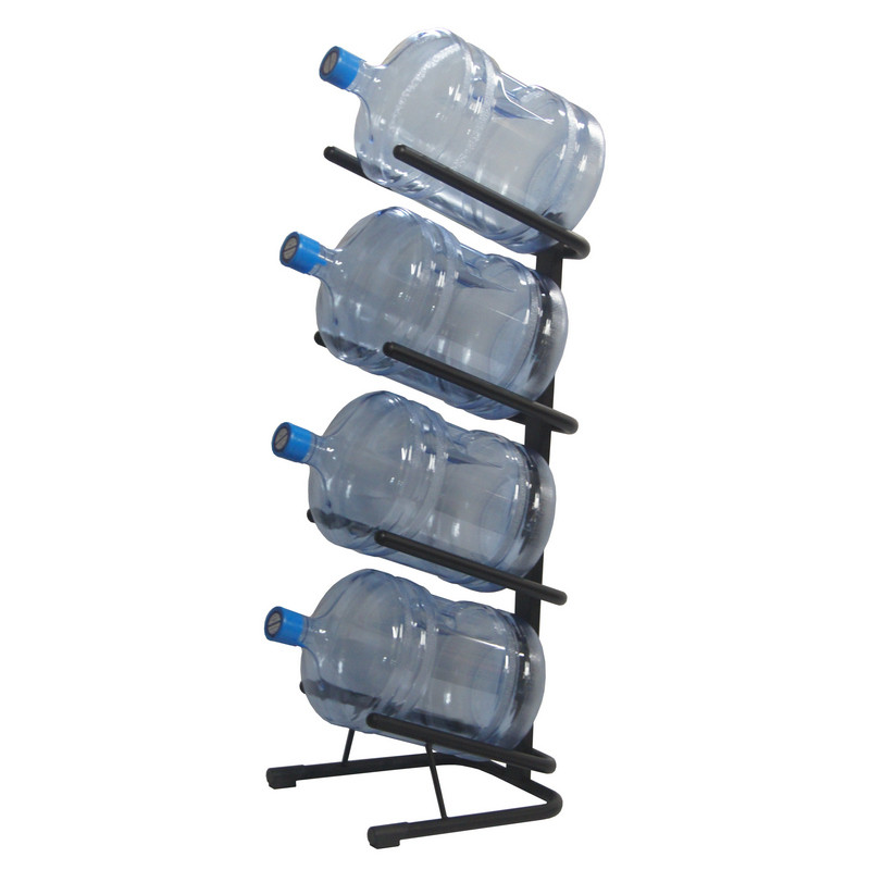 Стеллаж для бутилированной воды Бридж-4. Предназначен для организации хранения бутилированной воды в офисе, дома, на складе на минимальной площади. Полки стеллажа имеют оптимальный угол наклона, для удобства размещения и извлечения бутылей. Стеллаж оборудован подпятниками, что позволяет избежать повреждения напольного покрытия при его перемещении. Основание стеллажа не замкнуто, что удобно для уборки пола. Стеллаж имеет порошковое покрытие черного цвета, устойчивое к истиранию. Толщина труб из стали равна 1,5 мм. Нагрузка на полку до 25 кг. <br>Изображения товаров на сайте не могут гарантировать точную цветопередачу.