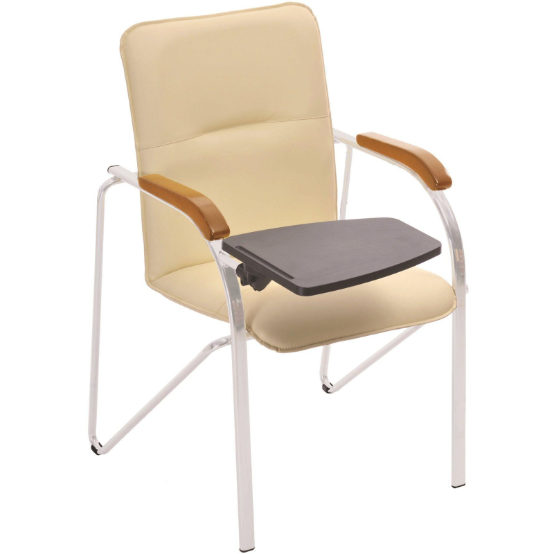 Внимание! Пожалуйста, проверяйте цвет изделия до начала сборки! Цвет на изображении товара в интернет-магазине или в печатном каталоге может отличаться от оригинала из-за особенностей цветопередачи. Конференц-кресло Samba ST (со столиком) подходит для конференц-залов, для приема посетителей в офисе, для дома. Обито кожзаменителем светло-бежевого цвета. Каркас выполнен из серебристого металла. На подлокотниках - деревянные вставки цвета бук. Максимальная статическая нагрузка - 100 кг.