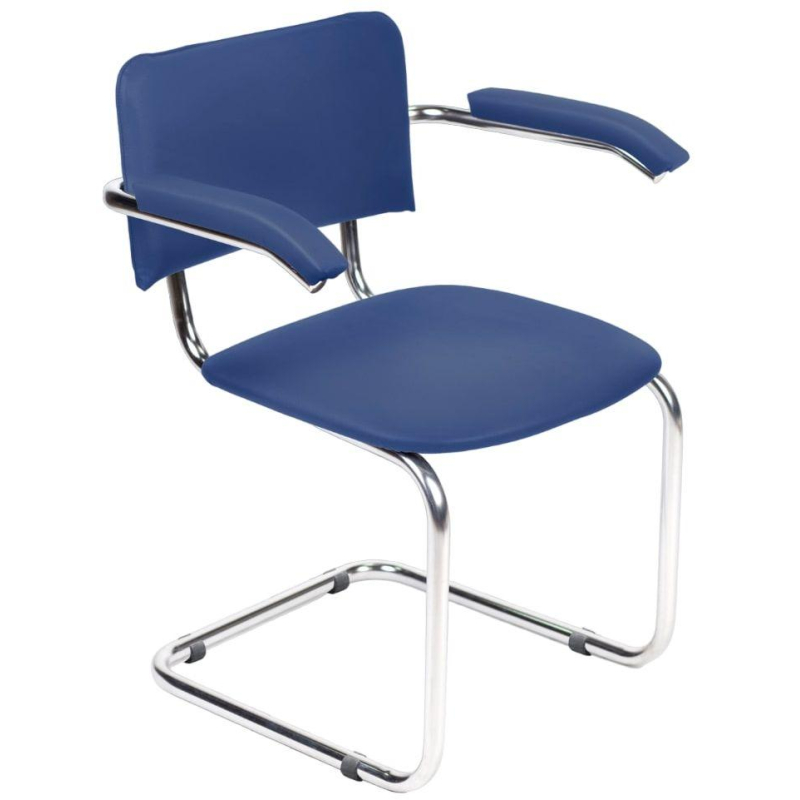 Внимание! Пожалуйста, проверяйте цвет изделия до начала сборки! Цвет на изображении товара в интернет-магазине или в печатном каталоге может отличаться от оригинала из-за особенностей цветопередачи. Стул офисный Silwia Arm с сиденьем, спинкой и подлокотниками из искусственной кожи синего цвета. Эргономичный каркас выполнен из хромированного металла, есть накладки для сохранности напольного покрытия. Максимальная статическая нагрузка - 100 кг.