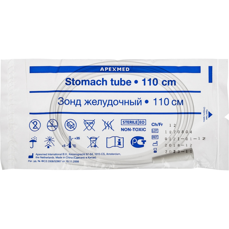 Зонд стерильный, одноразовый, предназначен для желудочного зондирования с лечебной или диагностической целью. Отличительные характеристики: атравматичный дистальный конец. Технические характеристики: стерилен, предназначен для однократного применения, изготовлен из прозрачного имплантационно-нетоксичного поливинилхлорида, термопластичный материал смягчается при температуре тела, общая длина зонда 110 см. Открытый конец, 4 боковых отверстия, метки от дистального конца расположены на расстоянии: первая - 46 см, вторая - 56 см, третья - 66 см, четвертая - 76 см. Размер СН/FR 12. Срок годности - 5 лет.