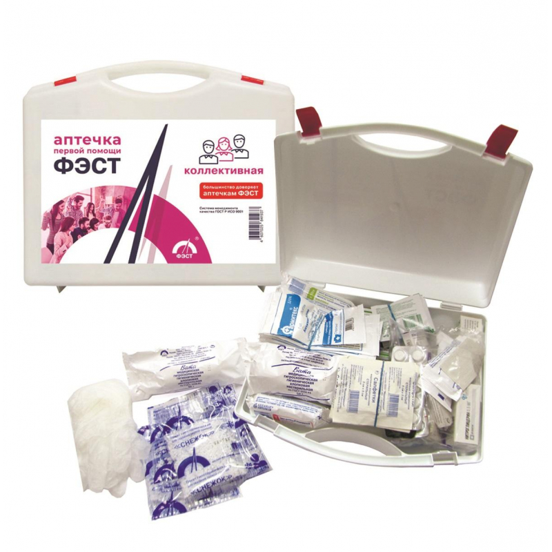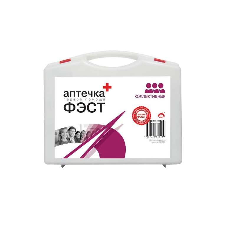 Аптечка первой помощи коллективная ФЭСТ. Рассчитана на рабочий коллектив из 15-20 человек. Используется в том случае, если есть необходимость обеспечить комплексную первую медицинскую помощь при возможных травмах и различных недомоганиях на рабочем месте. Изготавливается в соответствии с ТУ производителя. ТУ 9398-058-10973749-2008. Аптечка упакована в футляр-чемоданчик из полистирола размером 30,5x26,5x10 см. № Содержание коллективной аптечки ФЭСТ : Состав: 1. Анальгин, табл. 0,5 № 10 2 уп. 2. Гипотермический (охлаждающий) пакет 3 уп. 3. Жгут кровоостанавливающий 1 шт. 4. Бинт стерильный 5 м х 10 см или 5 м х 7 см 3 уп. 5. Бинт стерильный 7 м х 14 см 3 уп. 6. Бинт нестерильный 5 м х 10 см 2 уп. 7. Атравматическая антимикробная салфетка 6x10 см № 1 10 уп. 8. Салфетки антисептические спиртовые 20 шт. 9. Кровоостанавливающая салфетка стерильная 6x10 см № 3 или салфетка марлевая стерильная 5x5 см 10 уп. 10. Раствор йода спиртовой 5%, 10 мл 2 фл. 11. Лейкопластырь 1x250 см 2 уп. 12. Бинт эластичный трубчатый медицинский нестерильный № 6 2 уп. 13. Вата, 50 г 2 уп. 14. Сульфацила натрия раствор 20%, 1 мл № 2 тюбик-капельница или 5 мл флакон-капельница 2 уп. 15. Перекиси водорода раствор 3%, 40 мл 2 фл. 16. Спрей Олазоль или Д-Пантенол мазь 5%, 25 г или Пантенол-ратиофарм 5%, 35 г 1 шт. 17. Нитроглицерин 1% раствор в масле, капс. № 20 1 уп. 18. Валидол, табл. № 6 2 уп. 19. Устройство для проведения искусственного дыхания Рот-Устройство-Рот 1 уп. 20. Аммиака раствор 10%, 10 мл 2 фл. 21. Уголь активированный, табл. № 10 2 уп. 22. Корвалол, 15 мл 2 фл. 23. Ножницы 1 шт. 24. Стаканчик мерный для приема лекарств 1 шт. 25. Термометр медицинский 1 шт. 26. Перчатки латексные нестерильные 3 пары 27. Футляр для аптечки 1 шт. Срок годности: 16 месяцев. Общие правила и рекомендации эксплуатации аптечек первой помощи: 1. Выделите общедоступное место для хранения аптечки, отметьте информационным знаком 'Аптечка'. 2. Регулярно напоминайте сотрудникам о наличии аптечки (1 раз в месяц или в 1 раз в квартал - в зависимости от специфики производства). 3. У секретаря, руководителя или в самой аптечке должна быть информация о сотрудниках с медицинским образованием и их контактные номера. 4. Регулярно проводите инвентаризацию аптечки на предмет наличия всех лекарств и их сроков годности. 5. Проверьте, чтобы лекарства в аптечке соответствовали типовым травмам рода деятельности предприятия. 6. Дополните аптечку лекарствами специфичных заболеваний (диабет, астма, аллергия и др.) 7. Наличие тонометра и термометра позволит быстрее определить какое лекарство необходимо дать сотруднику в ряде случаев. 8. Важно иметь контакты родственников или друзей, с кем можно связаться в случае критической ситуации. 9. Составьте подробную инструкцию с перечнем симптомов и лекарств. Разместите информационные плакаты. Это позволит не терять ценное время при оказании первой помощи.