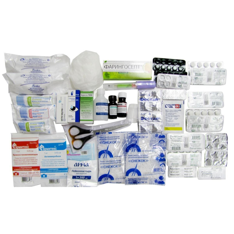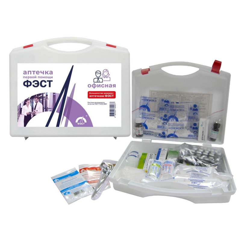 Аптечка первой помощи ФЭСТ для оснащения рабочих кабинетов, учреждений и организаций (офисная). Рассчитана на рабочий коллектив до 30 человек. Содержит все необходимое, чтобы оказать первую помощь при наиболее распространенных травмах и несчастных случаях, которые могут произойти непосредственно на рабочем месте. Изготавливается в соответствии с ТУ производителя (ТУ 9398-038-10973749-2015). Аптечка упакована в футляр-чемоданчик из полистирола размером 30,5x26,5x10 см. № Содержание офисной аптечки ФЭСТ: Состав: 1. Анальгин, табл. 0,5 № 10 2 уп. 2. Парацетамол, табл. 0,5 № 10 1 уп. 3. Ремантадин, табл. 0,05 № 10 1 уп. 4. Фервекс UPSA, порошок 1 шт. 5. Фарингосепт, табл. № 20 1 уп. 6. Ацетилсалициловая кислота, табл. 0,5 № 10 1 уп. 7. Гипотермический (охлаждающий) пакет 2 шт. 8. Дротаверина гидрохлорид (но-шпа), табл. 0,04 № 10 1 уп. 9. Супрастин, № 10 1 уп. 10. Папазол, табл. № 10 2 уп. 11. Бинт стерильный 5 м х 10 см или 5 м х 7 см 1 шт. 12. Бинт нестерильный 5 м х 10 см 1 шт. 13. Бинт нестерильный 5 м х 5 см 1 шт. 14. Салфетка атравматическая антимикробная 6x10 см или 7x10 см № 1 1 шт. 15. Лейкопластырь бактерицидный 1,9x7,2 см 5 уп. 16. Салфетки стерильные кровоостанавливающие 6x10 см или 7x10 см № 3 1 уп. 17. Бриллиантового зеленого раствор 1%, 10 мл 1 фл. 18. Лейкопластырь 1x250 см, 1x500 см или 2x500 см 1 уп. 19. Вата нестерильная, 50 г 2 уп. 20. Сульфацила натрия раствор 20%, 1 мл № 2 тюбик-капельница или 5 мл флакон-капельница 1 уп. 21. Перекиси водорода раствор 3%, 40 мл 1 фл. 22. Нитроглицерин 1% раствор в масле, капс. № 20 1 уп. 23. Валидол, табл. 0,06 № 6 2 уп. 24. Аммиака раствор 10%, 10 мл 1 фл. 25. Уголь активированный, табл. 0,25 № 10 3 уп. 26. Фестал, драже № 10 1 уп. 27. Ренни, табл. № 12 1 уп. 28. Корвалол, 15 мл 1 фл. 29. Стаканчик для приема лекарств 1 шт. 30. Ножницы 1 шт. 31. Термометр медицинский 1 шт. 32. Перчатки латексные 2 пары Срок годности: 18 месяцев. Общие правила и рекомендации эксплуатации аптечек первой помощи: 1. Выделите общедоступное место для хранения аптечки, отметьте информационным знаком 'Аптечка'. 2. Регулярно напоминайте сотрудникам о наличии аптечки (1 раз в месяц или в 1 раз в квартал-в зависимости от специфики производства). 3. У секретаря, руководителя или в самой аптечке должна быть информация о сотрудниках с медицинским образованием и их контактные номера. 4. Регулярно проводите инвентаризацию аптечки на предмет наличия всех лекарств и их сроков годности. 5. Проверьте, чтобы лекарства в аптечке соответствовали типовым травмам рода деятельности предприятия. 6. Дополните аптечку лекарствами специфичных заболеваний (диабет, астма, аллергия и др.) 7. Наличие тонометра и термометра позволит быстрее определить какое лекарство необходимо дать сотруднику в ряде случаев. 8. Важно иметь контакты родственников или друзей, с кем можно связаться в случае критической ситуации. 9. Составьте подробную инструкцию с перечнем симптомов и лекарств. Разместите информационные плакаты. Это позволит не терять ценное время при оказании первой помощи.