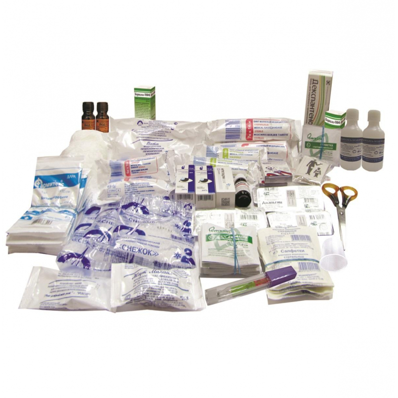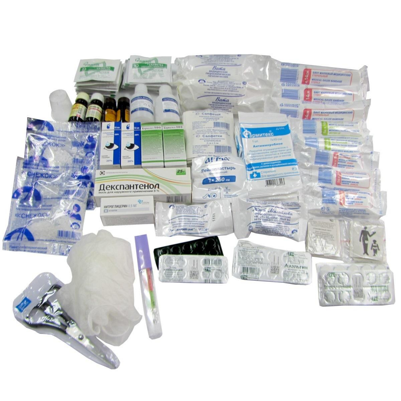Аптечка для оснащения предприятий, учреждений, производств. Для коллектива 15-20 человек. ТУ 9398-058-10973749-2008 Состав: 1. Анальгин, табл. 500 мг №10 2 упаковки. 2. Гипотермический (охлаждающий) пакет 3 упаковки. 3. Жгут кровоостанавливающий 1 штука. 4. Бинт стерильный 5 м х 10 см или 5 м х 7 см 3 штуки. 5. Бинт стерильный 7 м х 14 см 3 штуки. 6. Бинт нестерильный 5 м х 10 см 2 штуки. 7. Атравматическая антимикробная салфетка 6x10 см №1 10 штук. 8. Салфетки антисептические спиртовые 20 штук. 9. Кровоостанавливающая салфетка стерильная 6x10 см №3 или салфетка марлевая стерильная 5х5 см 10 штук. 10. Раствор йода спиртовой 5%, 10 мл 2 флакона. 11. Лейкопластырь 1х250 см 2 штуки. 12. Бинт эластичный трубчатый медицинский нестерильный №6 2 штуки. 13. Вата нестерильная, 50 г 2 упаковки. 14. Сульфацил-натрия раствор 20%, 1 мл №2 тюбик-капельница или 5 мл флакон-капельница или 10 мл 2 упаковки. 15. Перекиси водорода раствор 3% - 40 мл 2 флакона. 16. Спрей Олазоль или Д-Пантенол мазь 5%, 25 г или Пантенол-ратиофарм 5% - 35 г 1 штука. 17. Нитроглицерин, капс. 0,5 мг №20 или табл. 0,5 мг №40 1 упаковка. 18. Валидол, табл. 60 мг №6 или №10 2 упаковки. 19. Устройство для проведения искусственного дыхания Рот-Устройство-Рот 1 упаковка. 20. Аммиака раствор 10%, 10 мл или 40 мл 2 флакона. 21. Уголь активированный, табл. 250 мг №10 2 упаковки. 22. Корвалол, 15 мл 2 флакона. 23. Ножницы 1 штука. 24. Стаканчик мерный 1 штука. 25. Термометр медицинский 1 штука. 26. Перчатки нестерильные 3 пары. 27. Футляр для аптечки 1 штука. Общие правила и рекомендации эксплуатации аптечек первой помощи: 1. Выделите общедоступное место для хранения аптечки, отметьте информационным знаком 'Аптечка'. 2. Регулярно напоминайте сотрудникам о наличии аптечки (1 раз в месяц или в 1 раз в квартал - в зависимости от специфики производства). 3. У секретаря, руководителя или в самой аптечке должна быть информация о сотрудниках с медицинским образованием и их контактные номера. 4. Регулярно проводите инвентаризацию аптечки на предмет наличия всех лекарств и их сроков годности. 5. Проверьте, чтобы лекарства в аптечке соответствовали типовым травмам рода деятельности предприятия. 6. Дополните аптечку лекарствами специфичных заболеваний (диабет, астма, аллергия и др.) 7. Наличие тонометра и термометра позволит быстрее определить какое лекарство необходимо дать сотруднику в ряде случаев. 8. Важно иметь контакты родственников или друзей, с кем можно связаться в случае критической ситуации. 9. Составьте подробную инструкцию с перечнем симптомов и лекарств. Разместите информационные плакаты. Это позволит не терять ценное время при оказании первой помощи.
