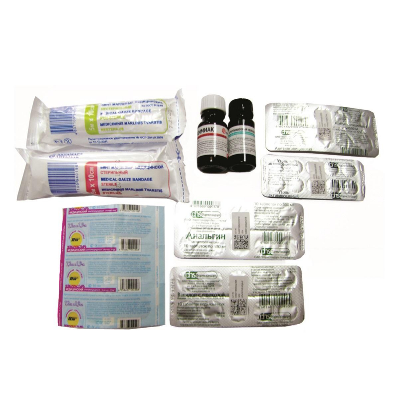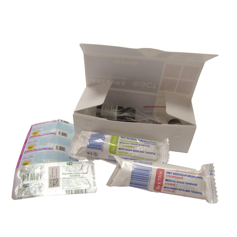 Миниатюрная индивидуальная аптечка 'ФЭСТ' используется для экстренной помощи одному человеку. Медицинские препараты, перевязочные и дезинфицирующие материалы упакованы в жесткий футляр размером 17x7х5,8 см. № Содержание индивидуальной аптечки 'ФЭСТ' Кол-во: 1. Анальгин 500 мг № 10, табл. 1 уп. 2. Ацетилсалициловая кислота 500 мг № 10, табл. 1 уп. 3. Бинт стерильный 5 м х 10 см 1 шт. 4. Бинт нестерильный 5 м х 10 см 1 шт. 5. Раствор бриллиантового зеленого 1% 10 мл 1 фл. 6. Лейкопластырь бактерицидный 1,9x7,2 см 3 шт. 7. Валидол 60 мг № 6, табл. 1 уп. 8. Уголь активированный 250 мг № 10, табл. 1 уп. 9. Аммиака раствор 10% 10 мл или 40 мл 1 фл. Срок годности: 18 месяцев. Общие правила и рекомендации эксплуатации аптечек первой помощи: 1. Выделите общедоступное место для хранения аптечки, отметьте информационным знаком 'Аптечка'. 2. Регулярно напоминайте сотрудникам о наличии аптечки (1 раз в месяц или в 1 раз в квартал - в зависимости от специфики производства). 3. У секретаря, руководителя или в самой аптечке должна быть информация о сотрудниках с медицинским образованием и их контактные номера. 4. Регулярно проводите инвентаризацию аптечки на предмет наличия всех лекарств и их сроков годности. 5. Проверьте, чтобы лекарства в аптечке соответствовали типовым травмам рода деятельности предприятия. 6. Дополните аптечку лекарствами специфичных заболеваний (диабет, астма, аллергия и др.) 7. Наличие тонометра и термометра позволит быстрее определить какое лекарство необходимо дать сотруднику в ряде случаев. 8. Важно иметь контакты родственников или друзей, с кем можно связаться в случае критической ситуации. 9. Составьте подробную инструкцию с перечнем симптомов и лекарств. Разместите информационные плакаты. Это позволит не терять ценное время при оказании первой помощи. Аптечка 'ФЭСТ' соответствует ТУ 9398-041-10973749-2015.