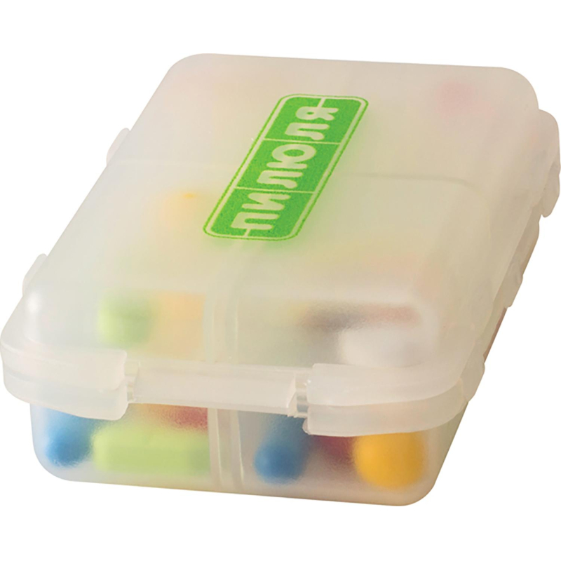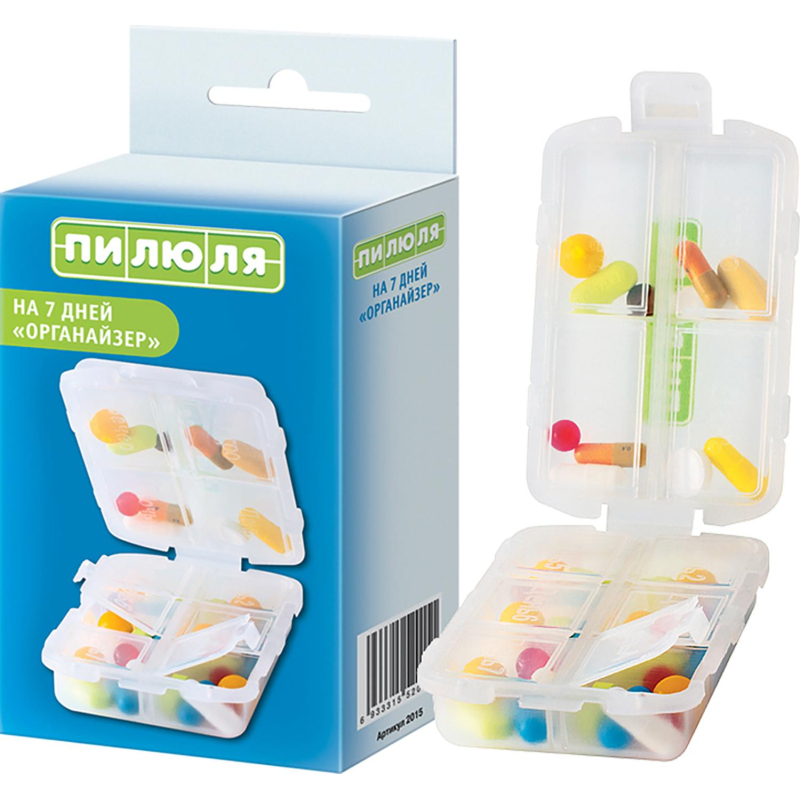 Контейнер состоит из 2-х блоков. Первый блок содержит 6 пронумерованных отделений, в каждое из которых помещается ежедневная доза необходимой продукции. Второй блок состоит из 4 отделений, для распределения таблетированной продукции в соответствии с суточным режимом приема: утро, день, вечер, ночь. Размер: 10,5*6,5*3,5 см