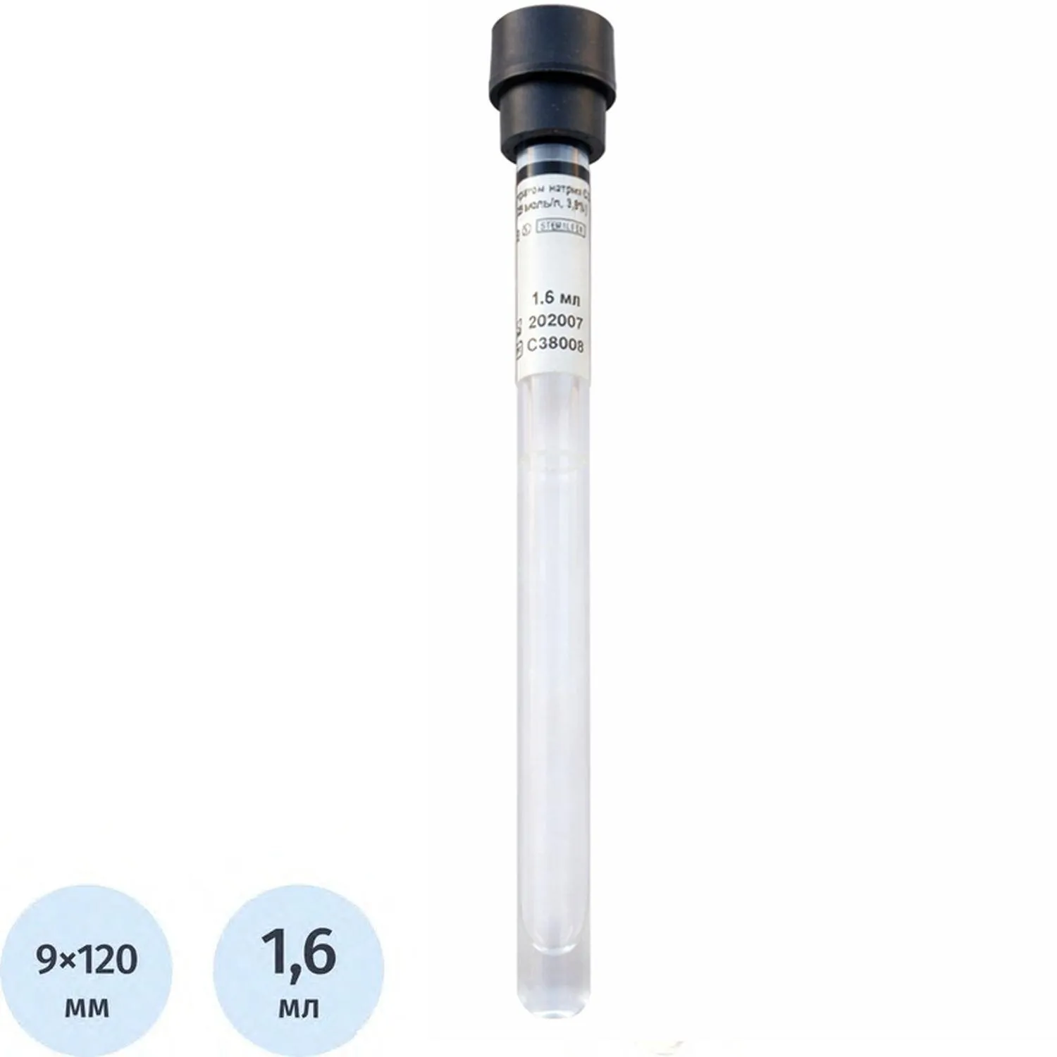 Вакуумные пробирки с наполнителем для исследования СОЭ 1,6 мл из стекла. Используются для исследования скорости оседания эритроцитов (СОЭ). Наполнитель: цитрат натрия 3,8%. Крышка пробирки: резиновая пробка. Служит для многократного прокола. Имеется дополнительный защитный пластиковый колпачок с вертикальными наружными бороздками, без резьбы. Этикетка: бумажная с двойным отрывным цифровым кодом, с указанием сведений о стерильности, заводе изготовителе, сроке годности, объеме забираемой крови с двойным отрывным цифровым кодом. Цветовая кодировка пробирки: черная. Вакуумные пробирки поставляются в пенопластовом штативе в термоусадочной пленке с этикеткой. 100 штук в упаковке.