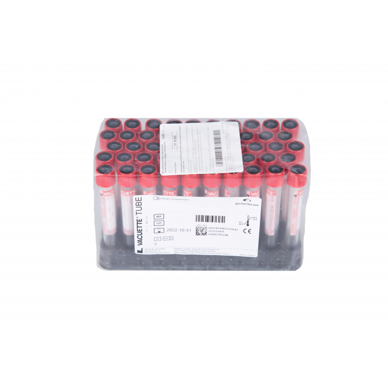 Вакуумные пробирки с активатором свертывания 9 мл из пластика (ПЭТФ). Область применения: биохимические, иммунохимические исследования, лекарственный мониторинг. Наполнитель: активатор свертывания. Крышка пробирки: резиновая пробка. Имеется дополнительный защитный пластиковый колпачок с вертикальными наружными бороздками, с резьбой. Этикетка: бумажная. Цветовая кодировка пробирки: красная. Вакуумные пробирки поставляются в пенопластовом штативе в термоусадочной пленке с этикеткой. 50 штук в упаковке.