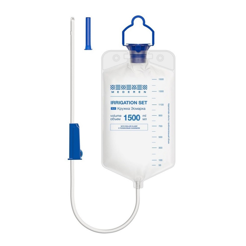 Кружка Эсмарха - это медицинское изделие, состоящее из резервуара, соединительной трубки и наконечника, чаще всего одноразовое и применяется не только для введения растворов в прямую кишку, но и для спринцеваний или орошений в гинекологии. Кружки Эсмарха удобны и безопасны в использовании, благодаря плотной горловине с крышкой и атравматичному дистальному концу, покрытому вазелином, стерильны. Кружка изготовлена из термопластичного ПВХ. Роликовый зажим для плавной регулировки потока раствора. Атравматичный дистальный конец покрытый вазелином и изолированный колпачком, для обеспечения безболезненного и легкого введения. Одно торцевое и одно боковое отверстие на дистальном конце. Плотная крышка на горловине предохраняет от случайного пролития жидкости. Удобная шкала на мешке для определения объема вводимого раствора. Длина соединительной трубки - 1.5 м, внешний диаметр - 6.5 мм, внутренний диаметр - 4.9 мм. Стерильная (оксид этилена), для одноразового применения. Объем: 1500 мл.