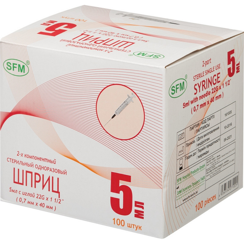 Шприц двухкомпонентный SFM 5 мл 22G (0.7x40 мм, 100 штук в упаковке). Предназначен для лекарственных инъекций. Шприцы имеют симметричную, тройную геометрическую заточку острия иглы, силиконовое покрытие на острие и стержне иглы, кристально прозрачный корпус, соединение Luer, плавное скользящее движение поршня, специальный упор для пальцев, обеспечивающий максимальную стабильность и комфорт. Шприцы безлатексные и не содержат силикон. Отдельная упаковка. Стерилизация - окисью этилена. Цветовая маркировка на прозрачном полипропиленовом основании иглы. На корпусе шприца несмываемая шкала с ценой деления 1 мл. В упаковке - 100 штук. В транспортном коробе - 2400 штук. Срок годности: 5 лет.