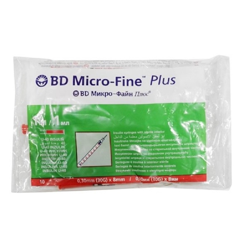 Шприц инсулиновый BD Micro-fine plus 1 мл U-40 30G (0.3x8 мм, 100 штук в упаковке). Инсулиновые шприцы отвечают индивидуальным потребностям и предпочтениям каждого пользователя. Несъемная игла, оптимальная геометрия острия иглы позволяют достигать максимального комфорта и надежности. Инсулиновые шприцы BD за счет тройной заточки острия иглы позволяют уменьшить усилие при совершении инъекции. Шприцы стерильны и предназначены только для однократного использования. Маркировка СЕ. Транспортная коробка - 500 штук. Стерилизация - этиленоксид. Срок годности: 5 лет.
