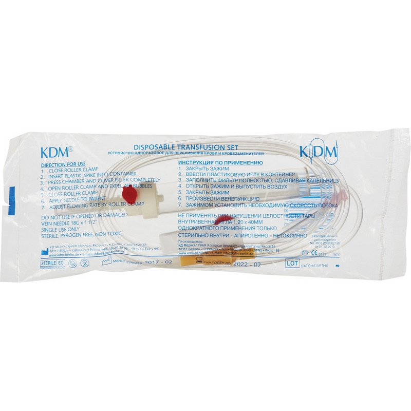 Система для переливания KDM пластиковый шип длина иглы 40 мм. Используется для постановки капельниц. Трансфузионная система для переливания крови. Безопасна в применении, удобна в работе для персонала. Описание основных функций: - Капельная камера со специальным микрофильтром размером 200 микрон; - Маркировка красным цветом для облегчения идентификации отличия от инфузионных систем; - Наличие воздушного клапана на капельной камере; - Разъем Луер, съемная игла 1,2x40 мм (18G) с трехгранной копьевидной заточкой; - Комбинированная пластиковая игла изготовлена по технологии 'острие типа карандаш', что позволяет уменьшить риск фрагментации пробки и вероятность нарушения проходимости иглы; - У системы отсутствует воздухозаборная игла, ее функции выполняет воздухозаборный клапан корпуса жидкостного фильтра; - Воздухозаборный клапан резервуара системы снабжен водонепроницаемой мембраной для очистки воздуха. Мембрана произведена из стекловолокна, процент очистки воздуха составляет 95% (стандарт - не менее 90%), что снижает риск нарушения стерильности вводимого раствора; - Стерильная трансфузионная система переливания крови снабжена нейлоновым жидкостным микрофильтром с минимально возможным диаметром ячейки 200 мкм, что не препятствует прохождению форменных элементов крови, сохраняет их целостность (степень гемолиза - до 1% при нормативе 5%) и в то же время очищает коллоидные растворы от возможных примесей; - Скорость потока 1100 мл/10 мин при стандарте 1000 мл/10 мин; - Роликовый регулятор плавно изменяет скорость введения: 20 капель = 1 мл; - Прозрачные соединительные трубки позволяют контролировать процедуру трансфузии; - Обработка иглы для венепункций силиконом для безболезненного введения; - Системы изготовлены из высококачественных и не токсичных материалов - Наличие индивидуальной упаковки; - Стерилизовано оксидом этилена; - Срок годности 5 лет; - Транспортная упаковка: 400 штук.
