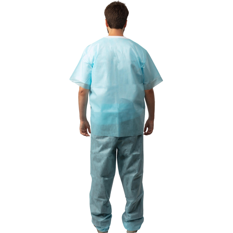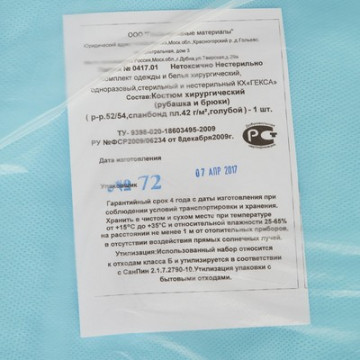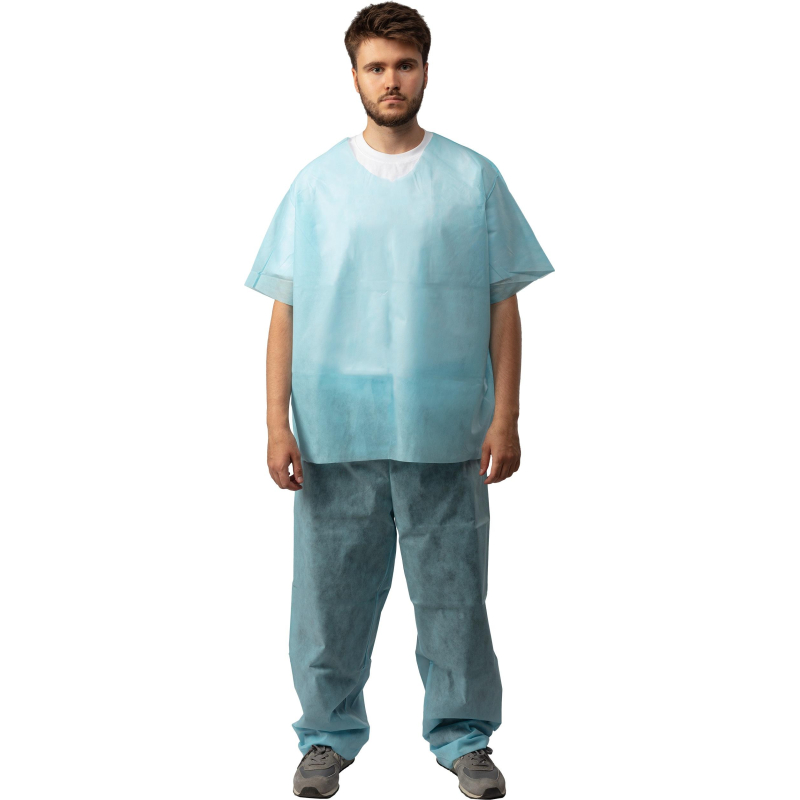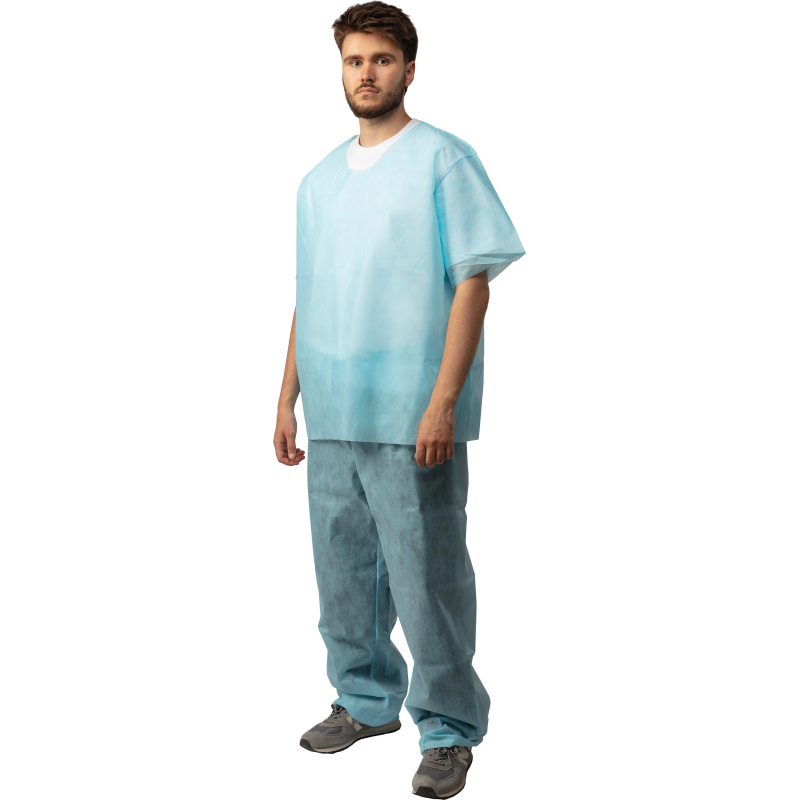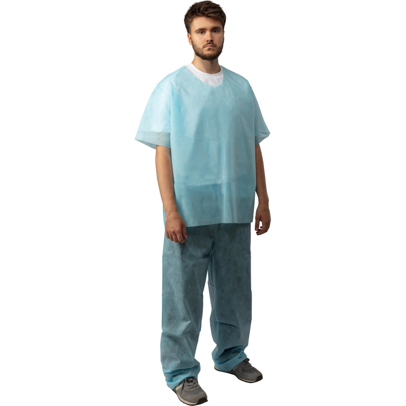 Костюм хирургический. Размер 52-54. Костюм состоит из рубашки и брюк. Рубашка прямого силуэта, без застежки, рукав короткий. Длина рубашки 79 см, Брюки прямые, без бокового шва. Длина по боковому шву 122 см. Швы наружные сварные (безниточные). Изготовлен из гипоаллергенного, безворсового, воздухопроницаемого, водоотталкивающего полипропиленового нетканого материала плотностью 42 г/кв.м. V образный вырез горловины. Нестерильный. Срок годности 4 года.