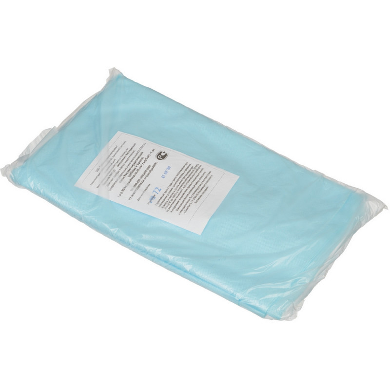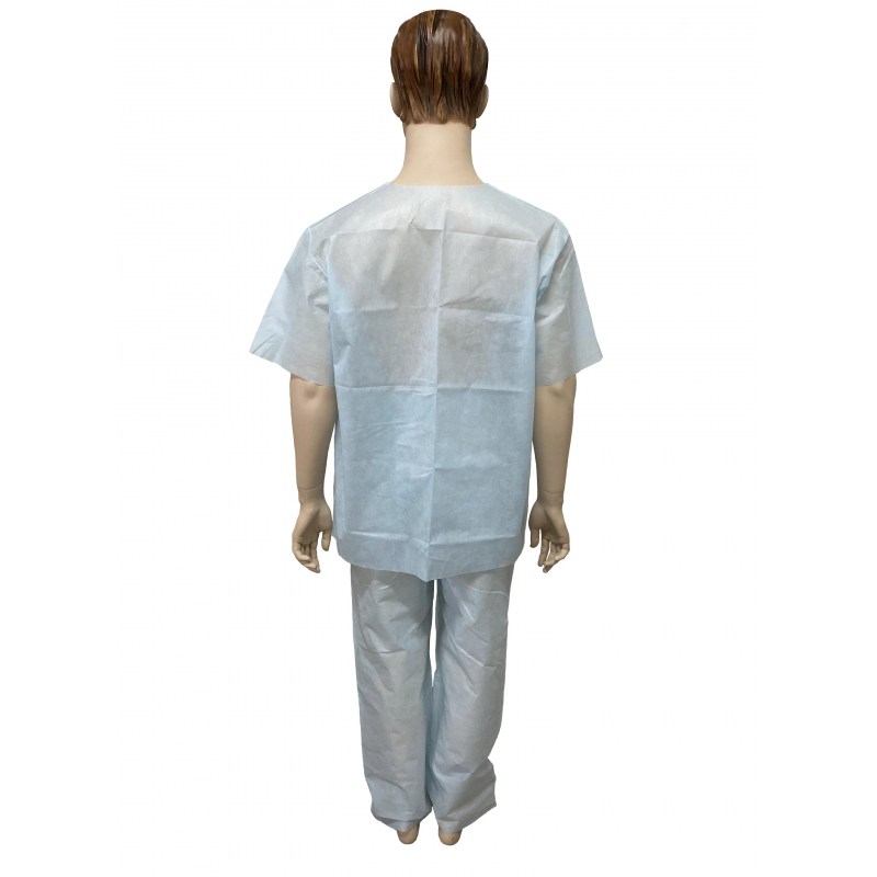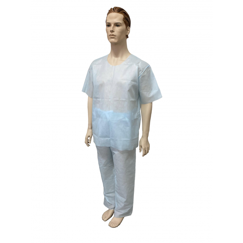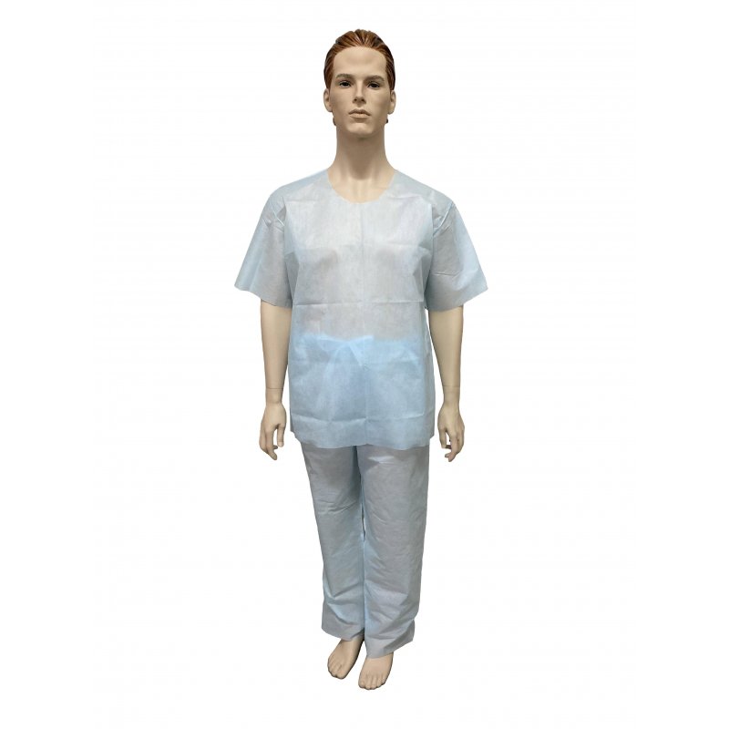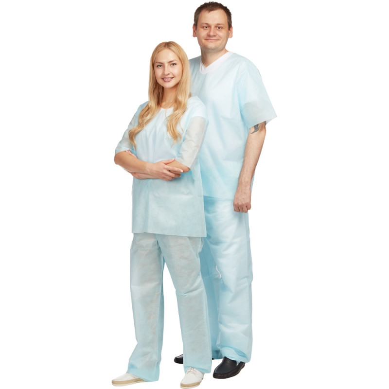 Костюм хирургический (рубашка + брюки). Размер 56-58. Костюм состоит из рубашки и брюк. Рубашка прямого силуэта, без застежки, рукав короткий. Длина рубашки 79 см, Брюки прямые, без бокового шва. Длина по боковому шву 122см. Швы наружные сварные (безниточные). Изготовлен из гипоаллергенного, безворсового, воздухопроницаемого, водоотталкивающего полипропиленового нетканого материала пл. 42 г/м2. V образный вырез горловины. Индивидуально упакован в комбинированный пакет из бумаги медицинской и многослойной полимерной пленки. Упаковка открывается без помощи ножниц. Стерильный.