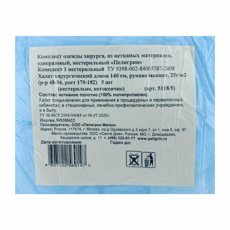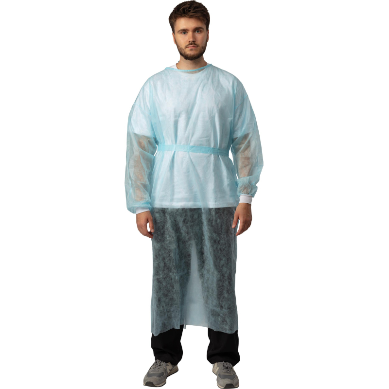 Халат одноразовый хирургический нестерильный рукав-манжета размер 48-54 (5 штук в упаковке) способствует снижению риска получения пациентом инфекционных осложнений при проведении врачебных манипуляций и оперативных вмешательств, защищает медицинский персонал с контаминированными биологическими жидкостями, служит предотвращению распространения внутрибольничной инфекции, предохраняет контактных лиц от заражения в эпидемическом очаге.