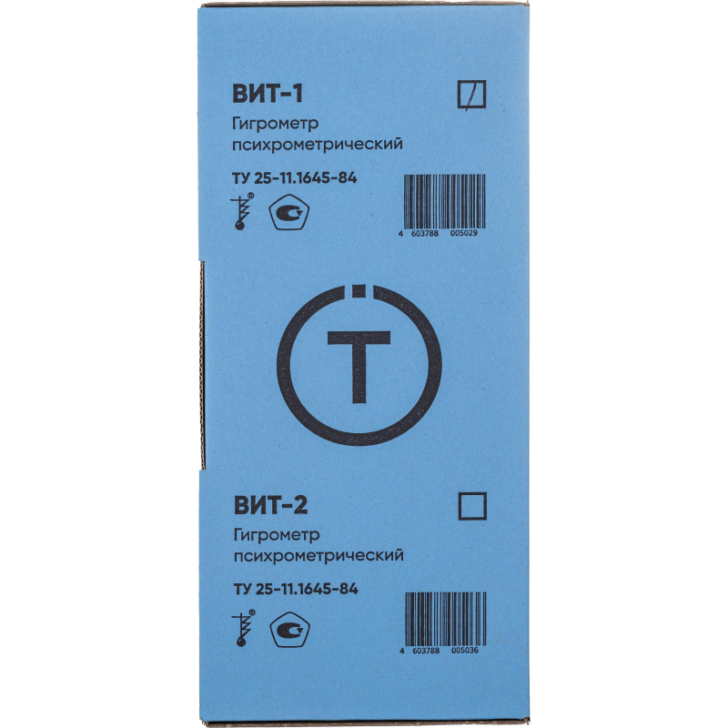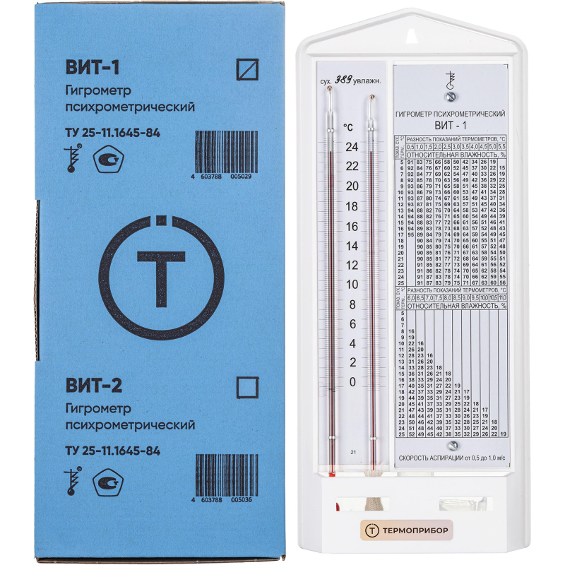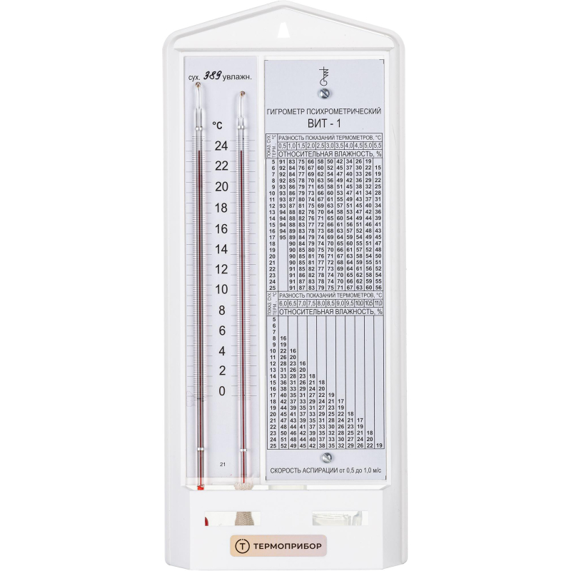 Гигрометр психрометрический предназначен для измерения относительной влажности и температуры воздуха в помещениях. Состоит из пластмассового основания, на котором закреплены температурная шкала с двумя капиллярами, резервуар одного из которых увлажняется фитилем из ткани, опущенным в питатель с водой, и таблица для определения относительной влажности воздуха по разнице показаний 'сухого' и 'увлажненного'. Питатель закреплен с внутренней стороны основания. Шкальная пластина и таблица - металлические. Термометрическая жидкость - толуол. Диапазон измерений термометра: от 0 °C до 25 °C. Цена деления: 0,2 °C. Изготовлен по ТУ25-11.1645-84. Имеет 'Свидетельство об утверждении типа средств измерений'.