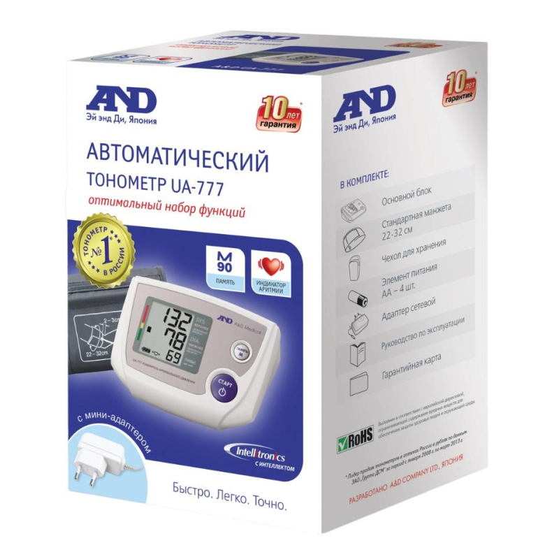 Тонометр №1 в России. Система интеллектуального управления Intellitronics. Память на 90 измерений, расчет среднего давления. Индикатор аритмии, цветная шкала ВОЗ (Всемирной организации здравоохранения). Стандартная манжета 22-32 см. Для простоты использования тексты на приборе и манжете написаны по-русски. В комплекте: тонометр, сетевой адаптер, элементы питания, манжета, чехол для хранения. Гарантия на основной блок в корпусе 10 лет. Прибор имеет поверку. Свидетельство о поверке вы можете найти на сайте производителя по серийному номеру (номер указан на упаковке).