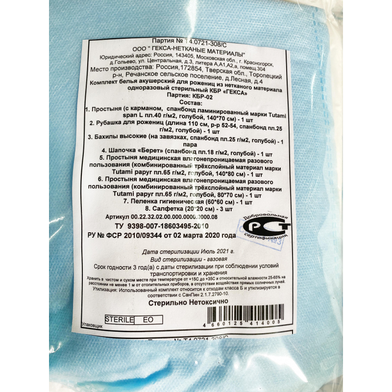 Комплект белья акушерский стерильный. Простыня медицинская 140х80 см и салфетка медицинская 70x80 см изготовлены из трехслойного влагонепроницаемого материала (бумага/полиэтилен/бумага), плотностью 95 г/м.кв. Верхний и нижний слой - целлюлозосодержащий материал. Средний слой выполнен из полимерного материала, который полностью предотвращает его промокание. Материал отлично впитывает влагу, распределяя ее по всей поверхности. Впитывающая пеленка 60x60 см имеет многослойную структуру: покрытие из нетканого материала, поглощающего слоя и внешнего покрытия из нескользящего полиэтилена. Мягкий впитывающий слой одноразовых пеленок из распущенной целлюлозы. Впитываемость 1050 мл. Рубашка для роженицы, длина 110 см. Наружный сварной (безниточный) шов. Изготовлена из дышащего нетканого полипропиленового материала плотностью 25 г/м.кв. Шапочка клип-берет в пакете хирургическая одноразовая гофрированная, с двумя защипками для создания объема, вдоль окружности приварена двухрядная резинка шириной 4 мм, которая обеспечивает плотное и комфортное прилегание края шапочки к голове. Исключая при этом пережатие сосудов головы. Диаметр при растянутой резинке 53 см. В сложенном виде шапочка-берет представляет собой полоску 20x2,5 см. Изготовлена без использования ниток (только сварные швы) из полипропиленового нетканого материала плотностью 18 г/м.кв. Материал обладает водоотталкивающими свойствами, воздухопроницаемостью, пониженным ворсоотделением. Бахилы высокие на резинке, высота 65 см. Наружный сварной (безниточный) шов. Изготовлены из дышащего нетканого полипропиленового материала плотностью 25 г/м.кв. Простыня защитная с карманом для сбора жидкости 140x70 см, цельнокройная. Карман на всю ширину простыни глубиной 40 см, пришит к простыне наружным сварным (безниточным) швом. Простыня и карман изготовлены из биоинертного, гипоаллергенного влагонепроницаемого ламинированного полипропиленового нетканого материала плотностью 40 г/м.кв. Комплект индивидуально упакован в комбинированный пакет из бумаги медицинской и многослойной полимерной пленки. Одна из сторон выполнена из прозрачной многослойной полимерной пленки, вторая из бумаги медицинской. Упаковка имеет систему быстрого вскрытия без помощи ножниц тип ?пил-эффект?, позволяющую сохранять стерильность содержимого при вскрытии. Вид стерилизации оксидом этилена, что позволяет избежать деструкции, снижение физико-механических свойств на материалы из которых изготовлены изделия. Срок годности 3 года. Комплектация: 1. Простыня медицинская 140х80 см - 1 штука. 2. Салфетка медицинская 70x80 см - 1 штука. 3. Впитывающая пеленка 60x60 см - 1 штука. 4. Рубашка для роженицы 110 см - 1 штука. 5. Шапочка клип-берет хирургическая одноразовая гофрированная - 1 штука. 6. Бахилы высокие на резинке - 1 пара. 7. Салфетка бумажная 20x20 см - 3 штуки. 8. Простыня защитная с карманом для сбора жидкости 140x70 см - 1 штука.