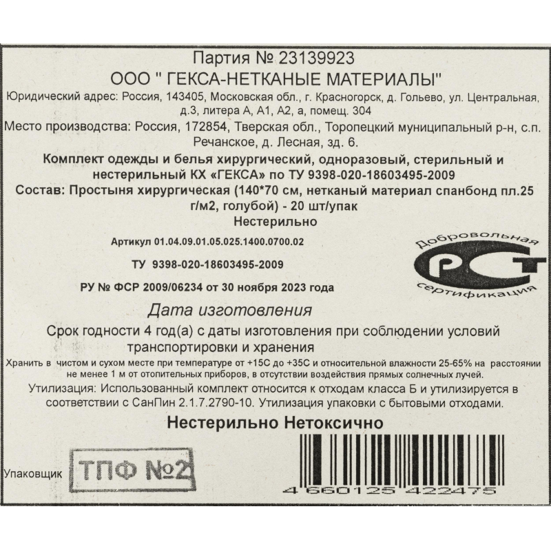 Простыня 140x70 см одноразовая. Изготовлена из гипоаллергенного, безворсового, воздухопроницаемого, водоотталкивающего полипропиленового нетканого материала плотностью 25 г/кв.м. Упакована в полиэтиленовый пакет. Нестерильная. Срок годности 4 года.