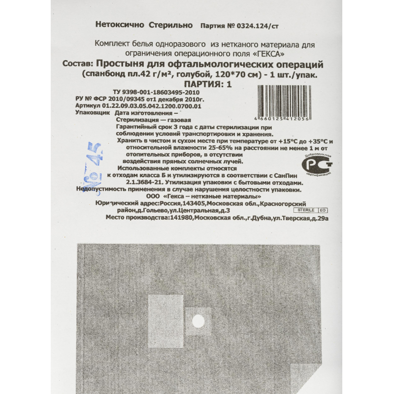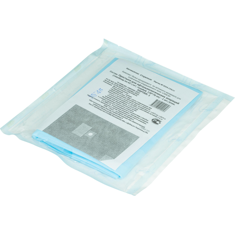 Простыня стерильная для офтальмологии. Размер простыни 1200x700 мм. В центре простыни круглое отверстие диаметром 6 см, с липким краем. Рядом с отверстием находится карман для сбора жидкости, размером 26x20 см. Гибкий край кармана позволяет придать ему удобную форму во время операции. Простыня изготовлена из гипоаллергенного, безворсового, воздухопроницаемого, водоотталкивающего полипропиленового нетканого материала спанбонд плотностью 42 г/кв.м, карман изготовлен из влагонепроницаемого полипропиленового материала ламинированный спанбонд плотностью 40 г/кв.м. Каждая простыня индивидуально упакована в комбинированный пакет из бумаги медицинской и многослойной полимерной пленки. Одна из сторон выполнена из прозрачной многослойной полимерной пленки, вторая из бумаги медицинской. Упаковка имеет систему быстрого вскрытия без помощи ножниц типа пил эффект, позволяющую сохранять стерильность содержимого при вскрытии. Стерилизация оксидом этилена, что позволяет избежать деструкции, снижения физико-механических свойств на материалы из которых изготовлены изделия. Срок годности 3 года.