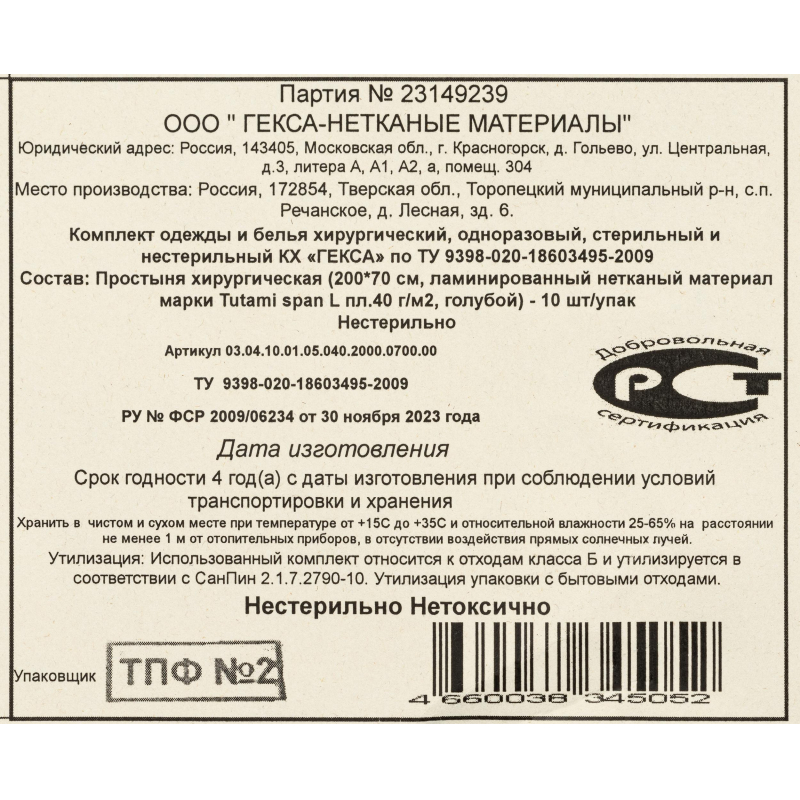 Простыня 200x70 см одноразовая. Изготовлена из гипоаллергенного, безворсового, влагонепроницаемого, водоотталкивающего полипропиленового нетканого материала плотностью 40 г/кв.м. Упакована в полиэтиленовый пакет. Нестерильная. Срок годности 4 года.