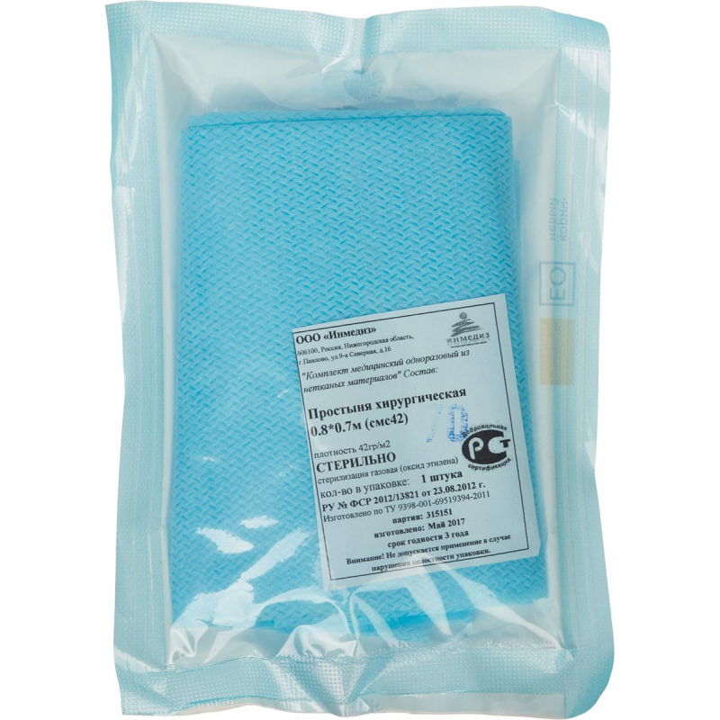 Простыня одноразовая (голубая), размер 80x70. Изготовлена из комбинированного гипоаллергенного, безворсового, воздухопроницаемого, водоотталкивающего 4-хслойного нетканого материала: внешние слои - спанбонд, два внутренних - мельтблаун. Плотность 42 г/кв.м. Стерильная. Срок годности 3 года.