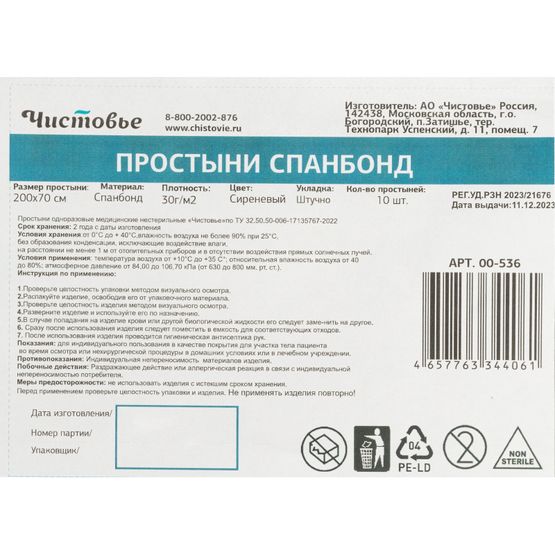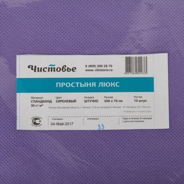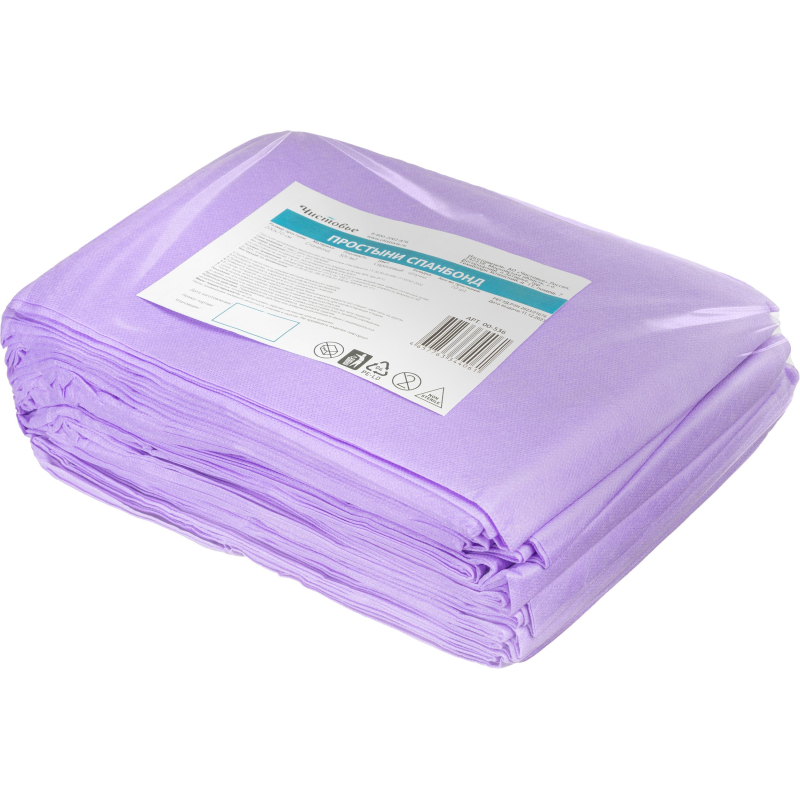 Простыня гигиеническая, нестерильная, изготовлена из гипоаллергенного материала спандбонд, плотностью 30 г/кв.м, размер 200х70 см, 10 штук в упаковке, сложены поштучно. Цвет сиреневый.