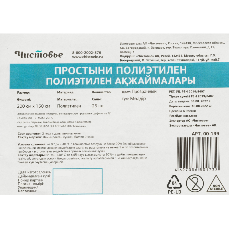 Простыня гигиеническая, нестерильная, изготовлена из водооталкивающего материала - полиэтилена, 25 штук в упаковке, защищает белье, постельные принадлежности и кушетки.