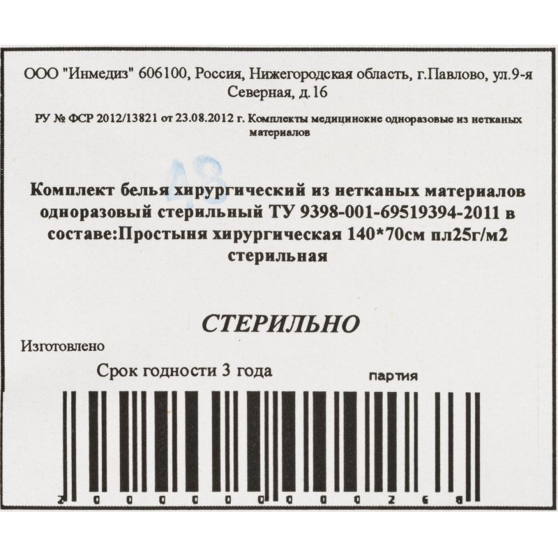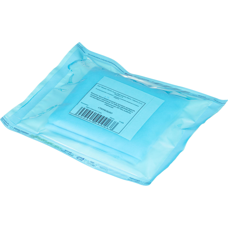 Простыня одноразовая (голубая), размер 140x70. Изготовлена из комбинированного гипоаллергенного, безворсового, воздухопроницаемого, водоотталкивающего 4-хслойного нетканого материала: внешние слои - спанбонд, два внутренних - мельтблаун. Плотность 25 г/кв. м. Стерильная. Срок годности 3 года.